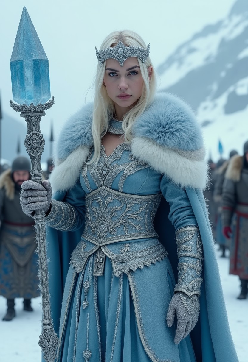 cinematic film still 22yo Woman portraying an Ice Witch from Kislev in Warhammer Fantasy Battles, wearing intricate frost-covered armor with fur-lined accents and an ornate blue and white cloak, gloves, holding an ice-encased staff topped with a glowing crystal, standing confidently in front of a massive Kislevite army. Hyper detailed captured from a front view with a fierce and determined expression, cold breath visible in the frigid air, photorealistic, icy blue and silver color palette, ultra detailed, skin pores, sharp focus, intricate details, highly detailed, background of snow-covered plains with soldiers in heavy armor, banners flapping in the icy wind, and distant snow-capped mountains under a stormy sky. <lora:FluxMythP0rtr4itStyle:0.6> mythp0rt . shallow depth of field, vignette, highly detailed, high budget, bokeh, cinemascope, moody, epic, gorgeous, film grain, grainy