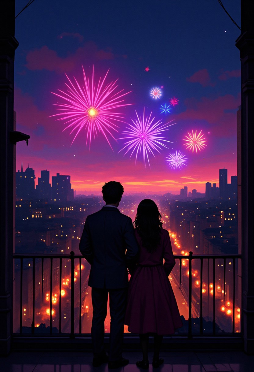ffdac, a couple, standing on a balcony, watching fireworks, cityscape, night