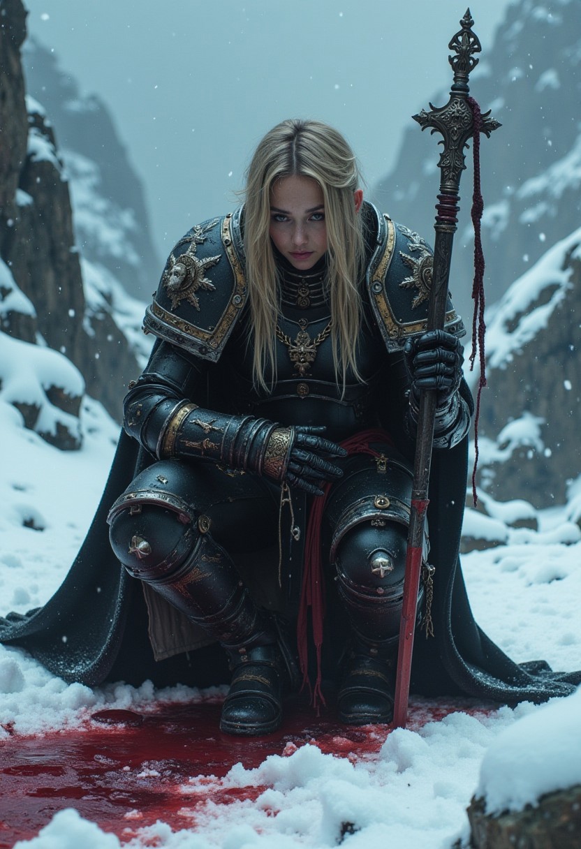 An atmospheric and powerful dark fantasy image, classical style painting of a beautiful female BlackT40k dressed in intricate dark power armor. She crouches with her head down and her dirty blonde hair falls over her face. She holds a powerful staff of dark steel. There is blood in the snow around her from a fallen enemy. Cinematic shot in a snowy mountainous region.