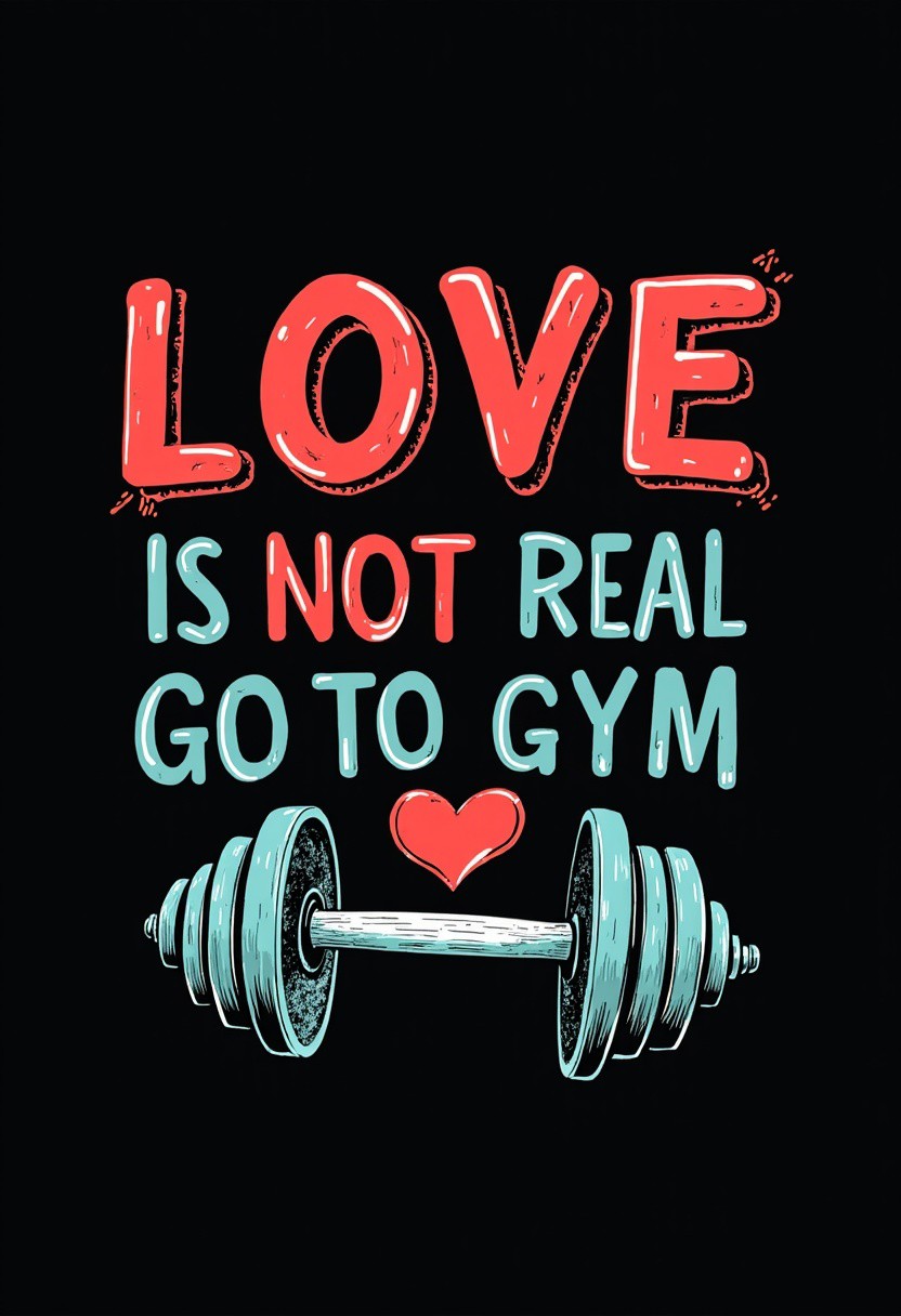 A humorous gym poster design with the statement "LOVE IS NOT REAL GO TO GYM". The "LOVE" words are styled with a heart shape, and the "GYM" words intertwine with a pair of weightlifting dumbbells. The background is a deep, dark black. The design is lighthearted and amusing, capturing the struggle of prioritizing fitness over romance. The typography and vibrant colors create a powerful statement on fitness and love, making this conceptual art piece both eye-catching and thought-provoking.