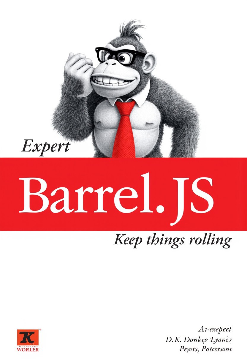 The image is a book cover featuring Donkey Kong wearing a red tie and glasses, rendered in grayscale pencil strokes, with subtle shading and texture details that give the drawing a realistic look, on a plain white background. Below Donkey Kong, a red rectangle spans the middle of the image, containing the words "Barrel.JS" in bold, capitalized white text. The word "Expert" is written above the bar in smaller, bold text. Below the red rectangle, the phrase "Keep things rolling" is written. In the bottom left of the image is the DK logo, and the bottom right has the author's name "D.K. Donkey Kong"