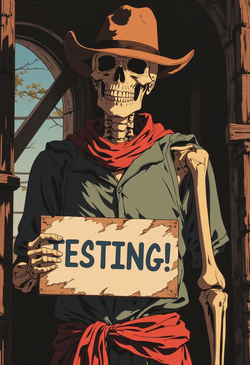 Skeleton wearing a cowboy hat, holding sign: TESTING!