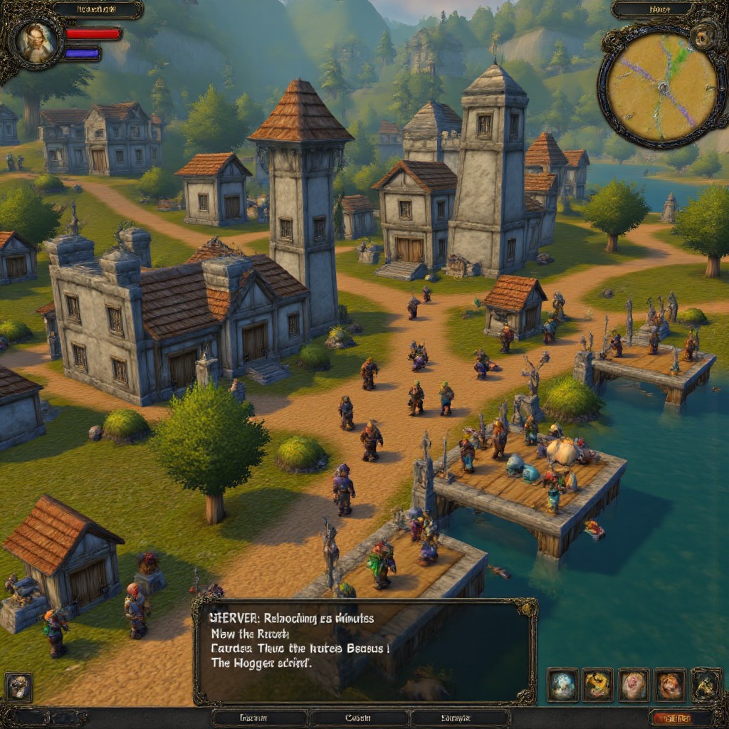 a world of warcraft screenshot, with user interface visible. Stormwind city castle and stone city grounds, on a spring day at noon. Lots of people walking around and merchants selling their wares. people fishing in the canals with bums drunk and telling stories while sitting on the pier. the walls of the city are stone and with wood doors. The city is alive with culture and festivities, with young and old people alike. The chat text box in the bottom center reads with text:"SERVER: Rebooting in 5 minutes, to reset Hogger script", the character name at the top left reads with text:"Tigole", the right top of the image reads with text:"Stormwind city". The minimap at the top right is a 2D overhead view of the area depicted in the 3d portion of the image.