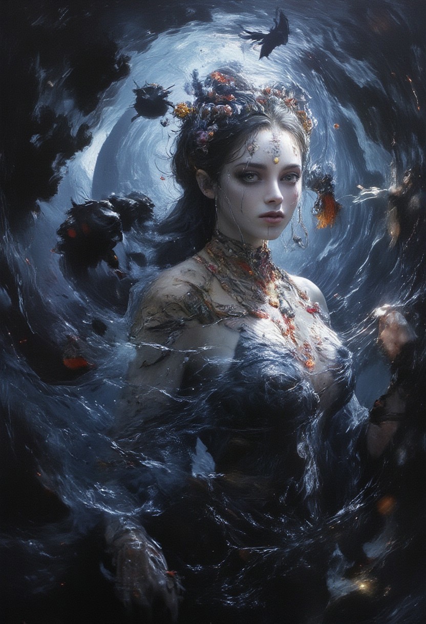 detailed renaissance oil painting, masterpiece, silhouetted, magic, directional lighting, masterpiece, perfect composition, woman made of water, regal, corrupted,