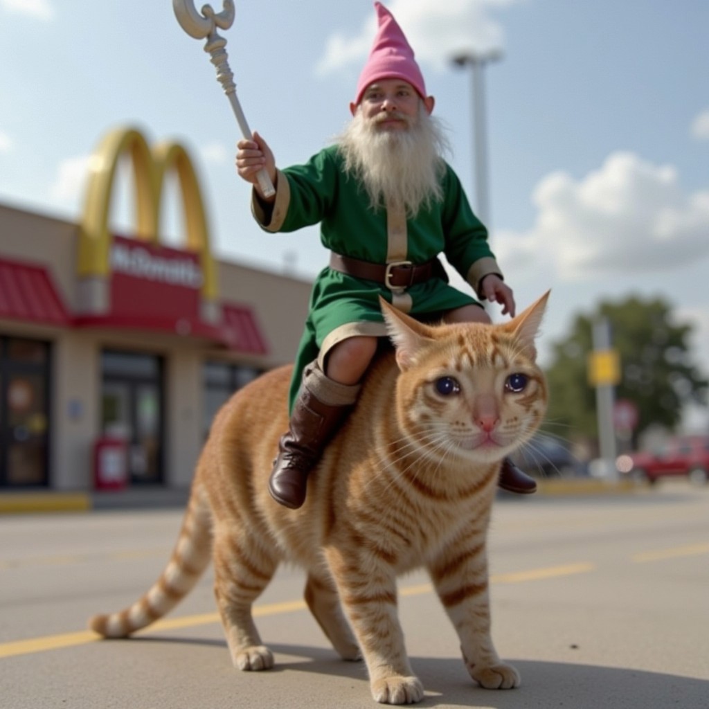 This image features a miniature man riding a normal sized crying cat. miniature man dressed as a gnome wizard wearing green robes with pink hat and holding a white staff, wizard sitting on cats head and rising his staff to above sky, the cat has orange fur. They are on an adventure behind them a Mcdonalds restaurant is visible . Gnome wizard is having fun but cat is crying. Image taken on day time, MEME image, funny