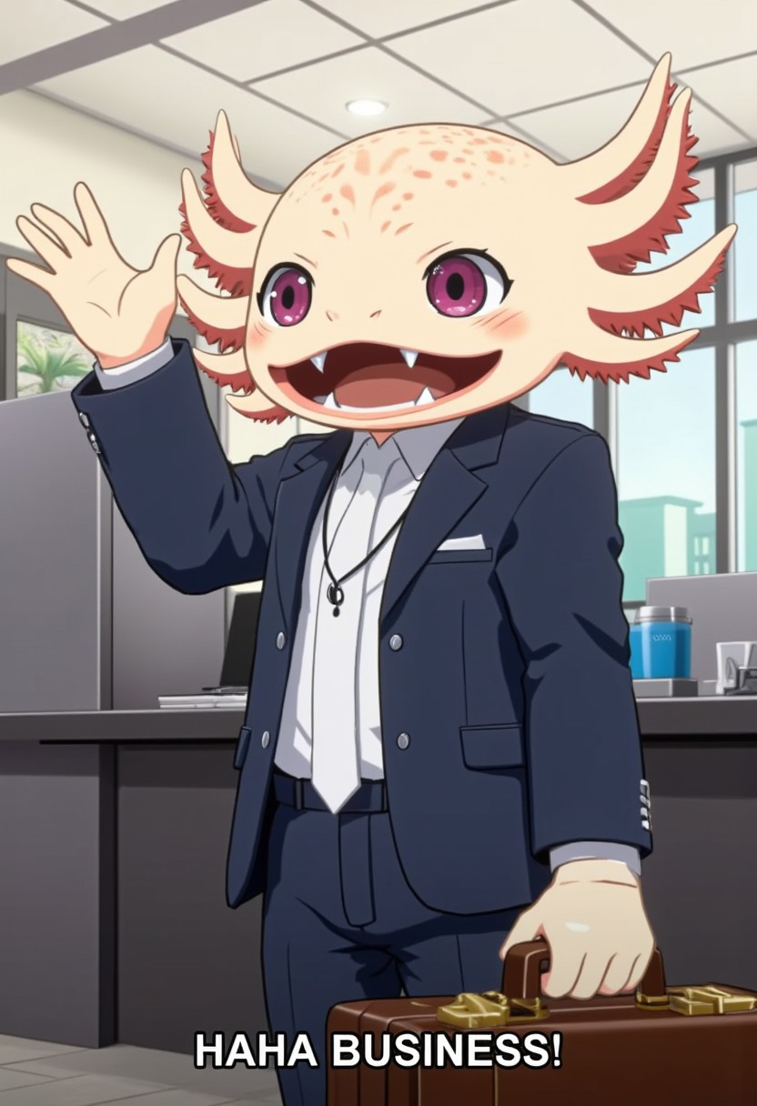 disgaea7style, anime, axolotl wearing a business suit at an office, holding a briefcase and looking excited. Image caption: "HAHA BUSINESS!"