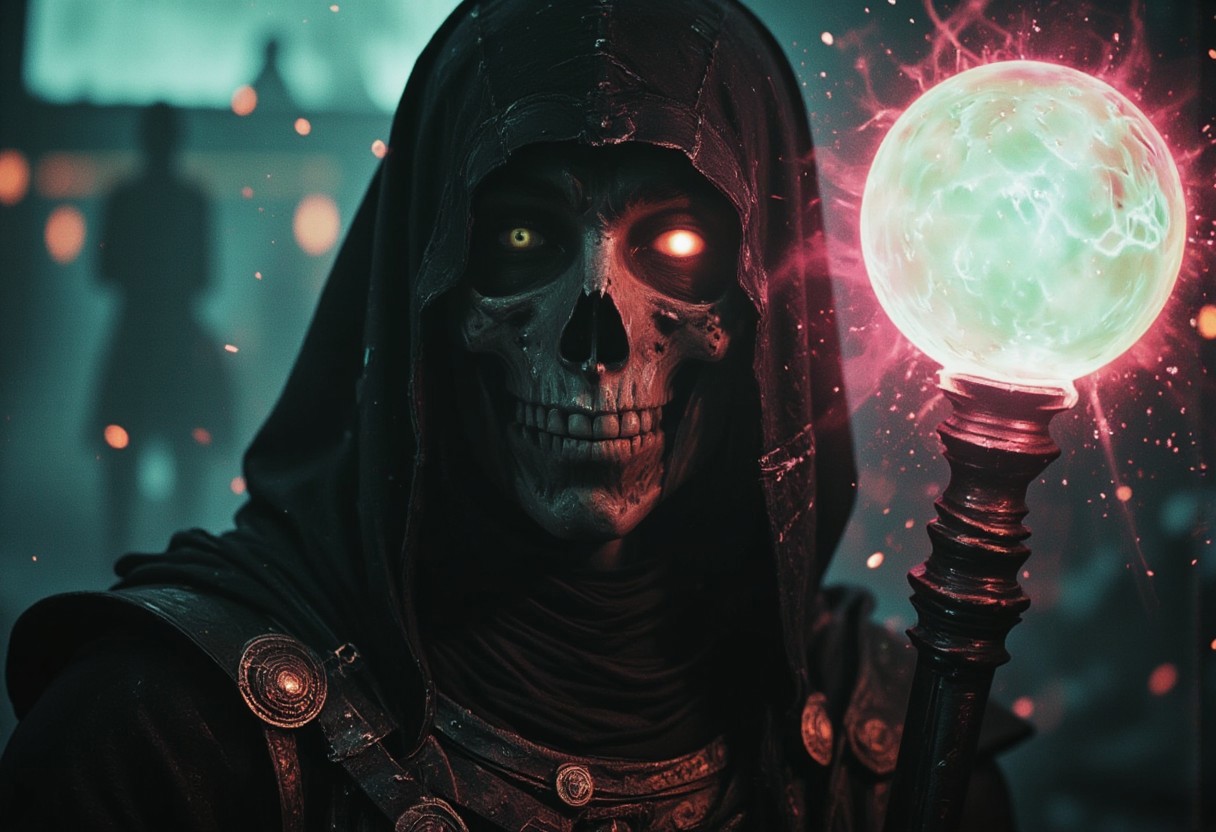 Pop Art Photograph, S1n0z1ck style, bold lines, The image is a dark, moody Photo with a surreal, almost gothic aesthetic. Flat color, planethead, planet-head, Face Zoom, Extreme Closeup Portrait of a skeletal Bedouin sorceress in a tattered armor-like robe that flows around her, embodying a mystical yet worn aesthetic. Her face resembles a translucent, deep black-amber sphere, partially obscured by a deep black hood that casts shadows over her features. Soft, ethereal steam gently rises from the sphere, enhancing its otherworldly presence. planet-head, planethead, Her powerful stance is accentuated as she wields an orb-staff topped with a translucent, magical pale pink Blue sphere, the breathtaking centerpiece of the image. The orb hums with energy, glowing intensely as it gathers the swirling souls of the battlefield. The sorceress stands amidst chaos, with debris and glowing spectral forms flying in every direction. Her robe flutters dramatically, contrasting against the deep blacks and muted greys of the battlefield. Focus on the pale colorful negativ black neon glow of the orb-staff, its light refracted in ethereal patterns, with soundwave-like distortions rippling through the energy as it bends the chaotic light surrounding her.,skelenecro, The scene is bathed in dim, atmospheric light, with washed-out neon hues of pink, green, and blue creating a surreal and moody aesthetic.