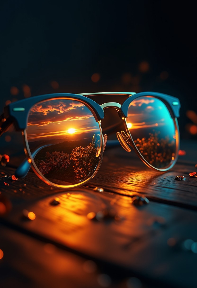 Abstract Lighting Effects, Hyperrealism, Midjourney Style, Photorealism, Cinematic, High Fidelity, Realism, Light Play Stunning surreal macro closeup photography of a magically reflected sunrise landscape on a pair of dark sunglasses. The frame of the sunglasses is cyan blue plastic and golden metal. The sunglasses are laying closed, face up on top of a wooden table in a dark room. The reflection of the sunrise lights the area around the sunglasses in a warm golden aura. The reflected image of a sunrise is beautiful, lush rolling hills, an orchard in autumn, some vanilla sky clouds. The image of a perfect beginning for an autumn day. The displayed landscape is a bright l, detail rich miniature magical. Beauty and magic is in the scene. The photography mainly uses golden and autumn colours, counterpointed with bright, deep cyan. The composition uses the golden spiral to focus on the beautiful sunrise displayed on sunglasses, the viewpoint is set looking from slightly above the sunglasses. The image uses a strong dark vingette to mask the surrounding.
