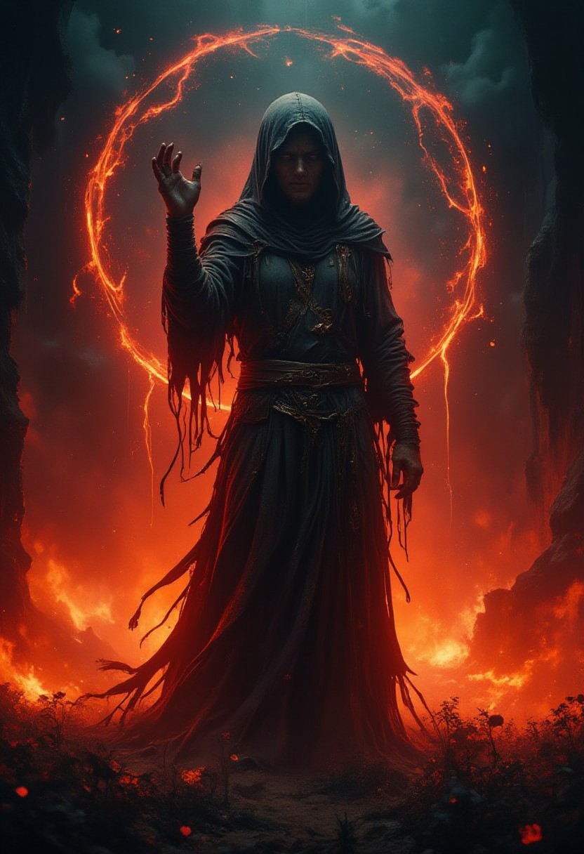 Cinematic style, Illustration, Dramatic Chiaroscuro, Ethereal Beauty, High Resolution, Vibrant Colorful Realistic analog photo, very detailed, hyper detailed, photorealistic, hyperdetailed, uhd, 4k, the focus of the image is on the witch, extreme closeup Face Portrait, extreme face closeup, head focus, Realistic analog photo, awesome, high Quality, photorealistic, atmospheric lighting, volumetric lighting, cinematic, Epic Film Quality, A muscular old magician stands in the midst of a ferocious DARK sandstormamidst a Desert night, His billowing Bioluminescent Aura and tattered robe barely clinging to his body, revealing glimpses of His scars and sweat-slicked skin. With one hand raised, he conjures a colossal, ancient vibrant black negativ luminous light spell from the swirling dust, its ethereal ghostly form towering above, terrifying and awe-inspiring. The hkmagic witch’s face is shrouded in the shadows of her hood, adding an air of dark mystery. The colorful Flower meadow landscape around her is cloaked in a dusty, dystopian atmosphere, with the sun obscured by the storm. The only light breaking through the chaos is the glowing dark-red aura of her powerful spell, casting an eerie illumination over the scene.