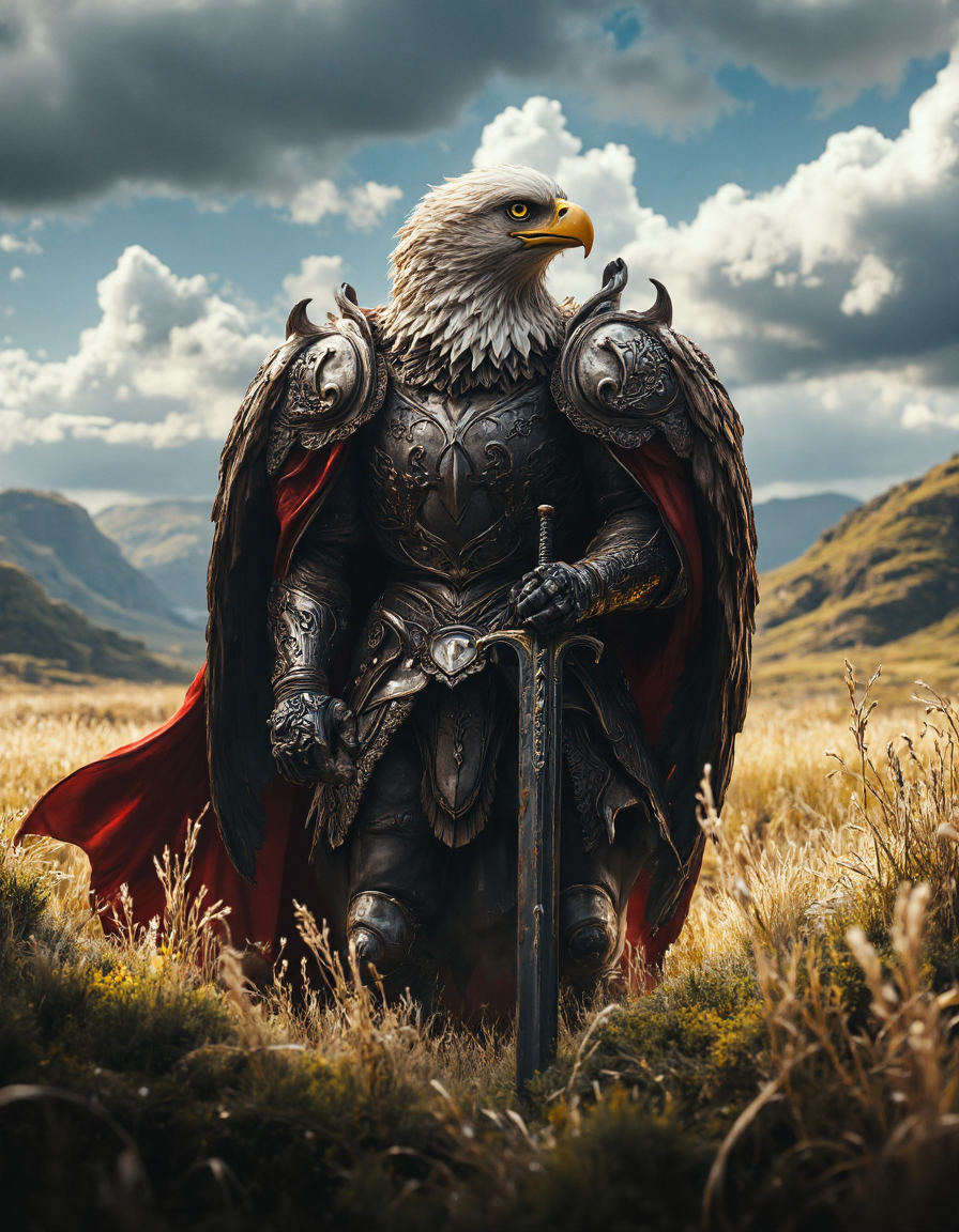 A highly detailed cinematic scene, A fantastical anthropomorphic eagle stands in a grassy field beneath a partly cloudy sky. The eagle, with feathers transitioning from white to brown, has a sharp yellow beak and piercing yellow eyes. Clad in intricate medieval-style armor, the eagle holds a long, ornate sword in its right hand, with the left resting on the hilt, poised for battle. A red cape flows dramatically behind, catching the light against the dark armor. The background showcases an open field of tall grasses and distant hills, illuminated by the warm glow of the setting sun. The serene yet ominous atmosphere, using rich colors and high detail. <lora:aidmaMJ6.1:0.8>, <lora:fluxenhancer:0.5>