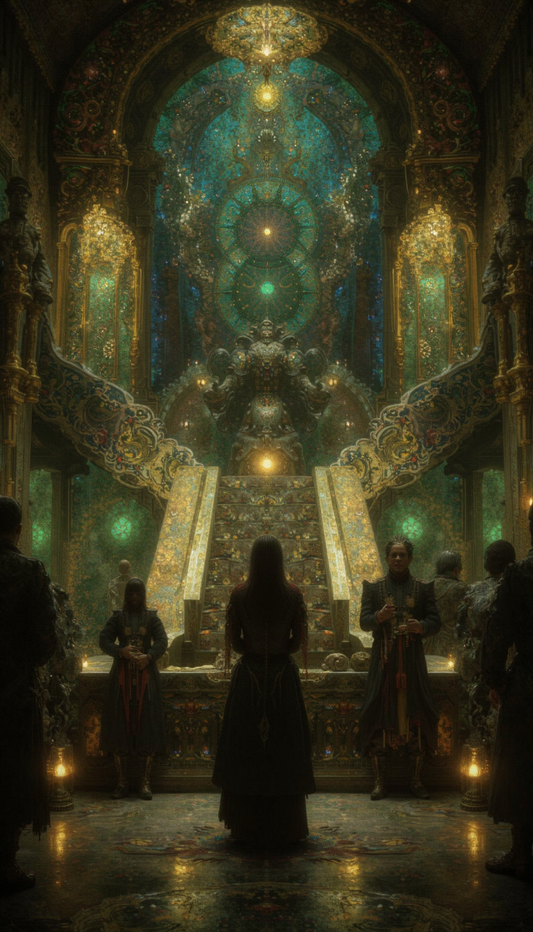 GLOW,intricate tetradic colors in every details,FLUORESCENT,asian woman, A gathering of celestially attired figures in an opulently adorned hall with a grand staircase. The scene shimmers with an ethereal luminescence, bathed in a palette of golds, greens, and blues reminiscent of art nouveau stained glass. Utilize a long focal length for a compressed perspective, emphasizing the grandeur of the architecture and the regality of the assembled figures. The background should feature intricate organic architectural motifs, evoking a sense of otherworldly grace and splendor. Emphasize the play of light and shadow, casting long, dramatic shadows that accentuate the depth and majesty of the scene. The image should exude an air of solemn anticipation, as if on the precipice of a momentous event.