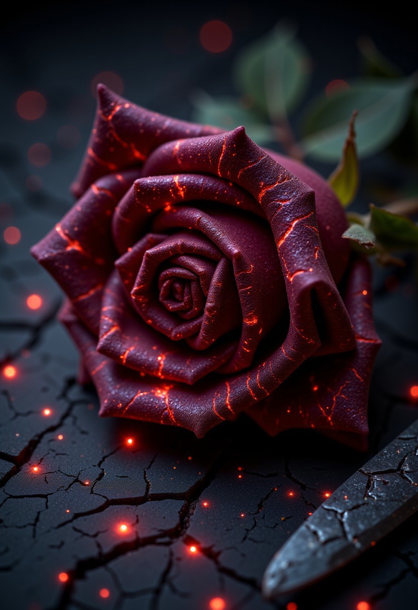 Make a very beautiful hyper-reliant black rose with red and gold cracks. The rose lies on a black stone with cracks. Around it glow many small red lights. Nearby lies a dagger very old covered with cracks made of black metal.
