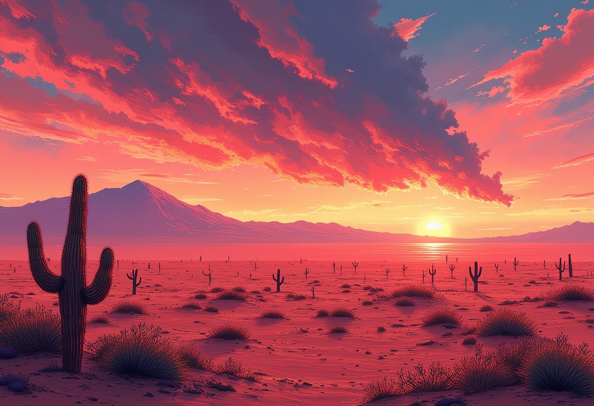 illustration in the style of Alena Aenami, the vast desert plain at the evening, a few cactuses, a mountain far away, the large sandstorm cloud approaches