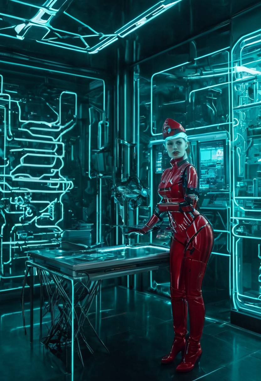 A breathtaking image of a cybernetic clinic entrance, a cyborg nurse in red uniform, jelly truquoise desk, high tech surgical instrument on a cyberpunk desk, highly detailed, high quality surreal image, movie poster style, hyperrealistic, 4k , photorealistic, close-up view,