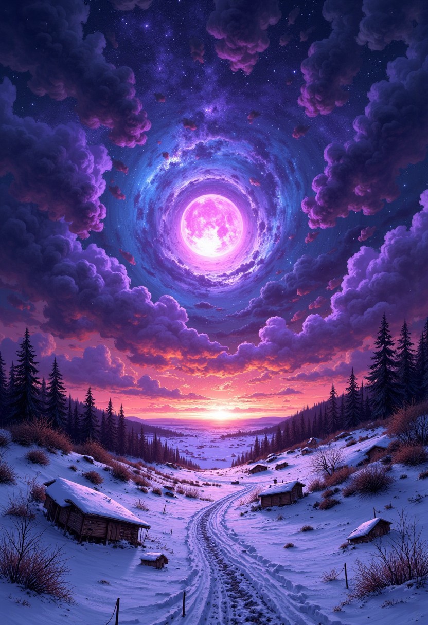 masterpiece, best quality, ,illustration style of Laurent Grasso, the storm is brewing in a busy sky (purple clouds circular) glowing starry sky, creating circular shape in the scary but beautiful sky, (howling wind:1.3), (dark clouds:1.2), sunset, desolate landscape, muted colors, dramatic atmosphere, oil painting, high detail, textured brushstrokes, moody lighting, ethereal quality.
