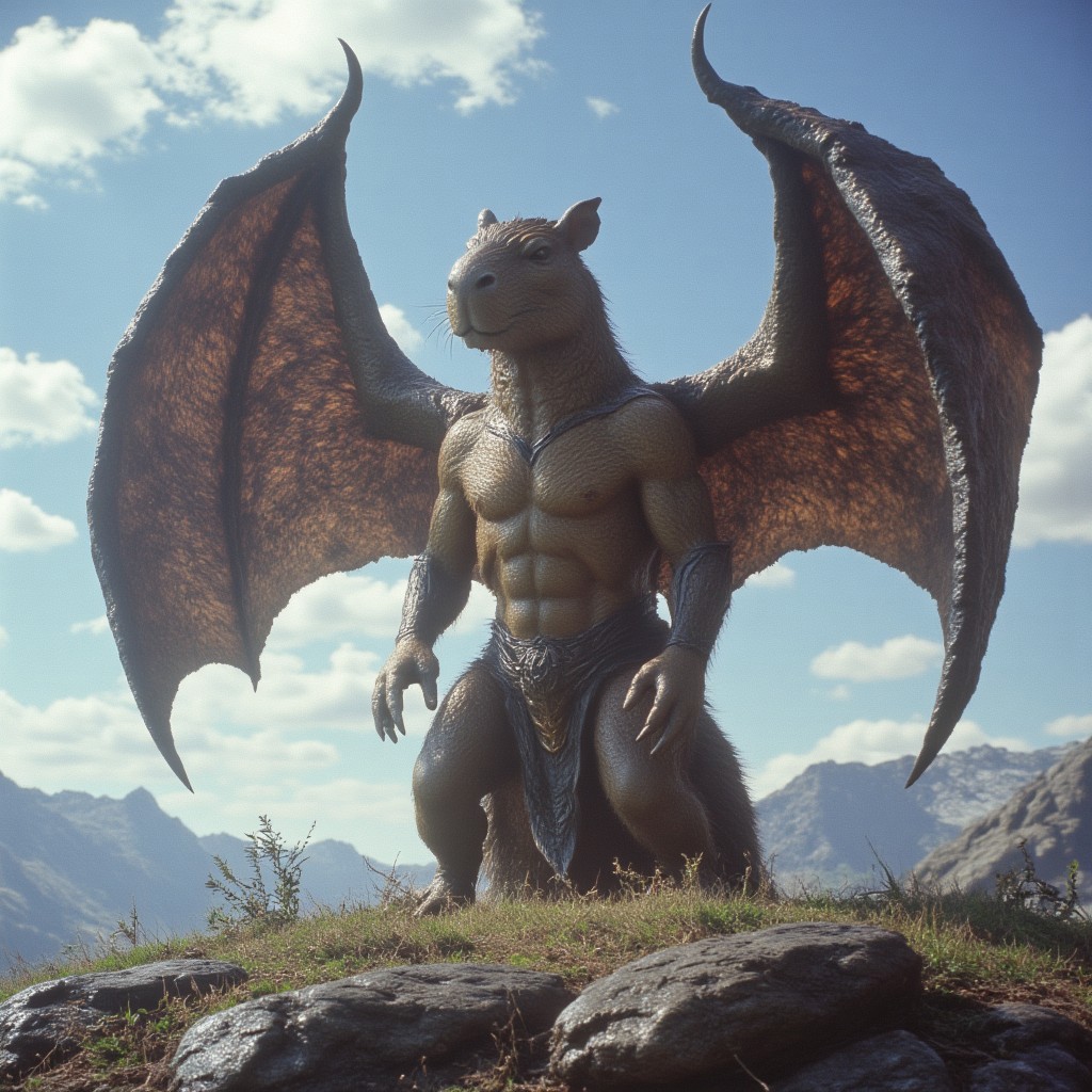 ArsMovieStill, 80s Fantasy Movie Still, A giant capybara with bat wings, capybara dragon hybrid, it stands menacingly on a hilltop
