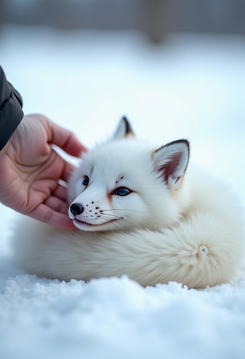 A small (fluffy Arctic fox with pure white fur:1.2) curls up in the snow, its pristine coat blending seamlessly with the icy surroundings. As a hand gently reaches to (stroke the fox’s soft head:1.3), its (innocent, shimmering eyes) reflect trust, glimmering in the cold light. The delicate texture of its (silky, snow-white fur:1.3) contrasts with the warmth of the hand. [Faint wisps of cold breath] rise from its tiny nose, which peeks out from behind its (bushy, cloud-like tail). The background fades into [a soft, blurred winter landscape], keeping the focus on the tender interaction. The (soft lighting:1.2) highlights the fox's pure fur, ensuring it maintains the delicate appearance of an Arctic fox, without shifting to a basic fox form. The scene is filled with (intimacy and calm), as the fox remains a gentle, snowy companion in the (vast, quiet wilderness).
