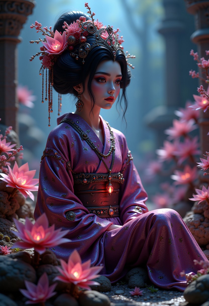 A professional photography of a gothic geisha with whimsical elements, surrounded by an magical and eerie fairytale landscape with sparkling crystals and colorful flowers, awesome appearence, fantastic cyberpunk art concept, intricate details, trending on artstation, masterpiece, 8k, magical glow, internal glow, magic, fantasy, glowing, colorful,