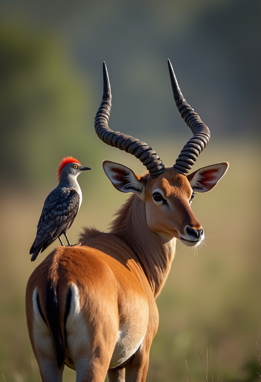 A vigilant (antelope), muscles subtly tensed, turns its head sharply to look back, eyes wide and alert. Its (sleek, tawny fur) ripples with each movement, catching the fading sunlight that creates a stark contrast against the (shadowy, jagged textures) of its spiraled horns. Perched on its back, a (red-billed oxpecker) clings with intensity, its wings slightly raised as if ready to take flight, its bright yellow eyes scanning the surroundings with equal urgency. [In the background, nature begins to blur], as if the encroaching dangers of the wild dissolve the once serene landscape into a swirling uncertainty. The atmosphere grows dense with tension, the (muted greens and browns) of the wilderness fading into an indistinct haze, symbolizing the raw, unforgiving reality of survival.