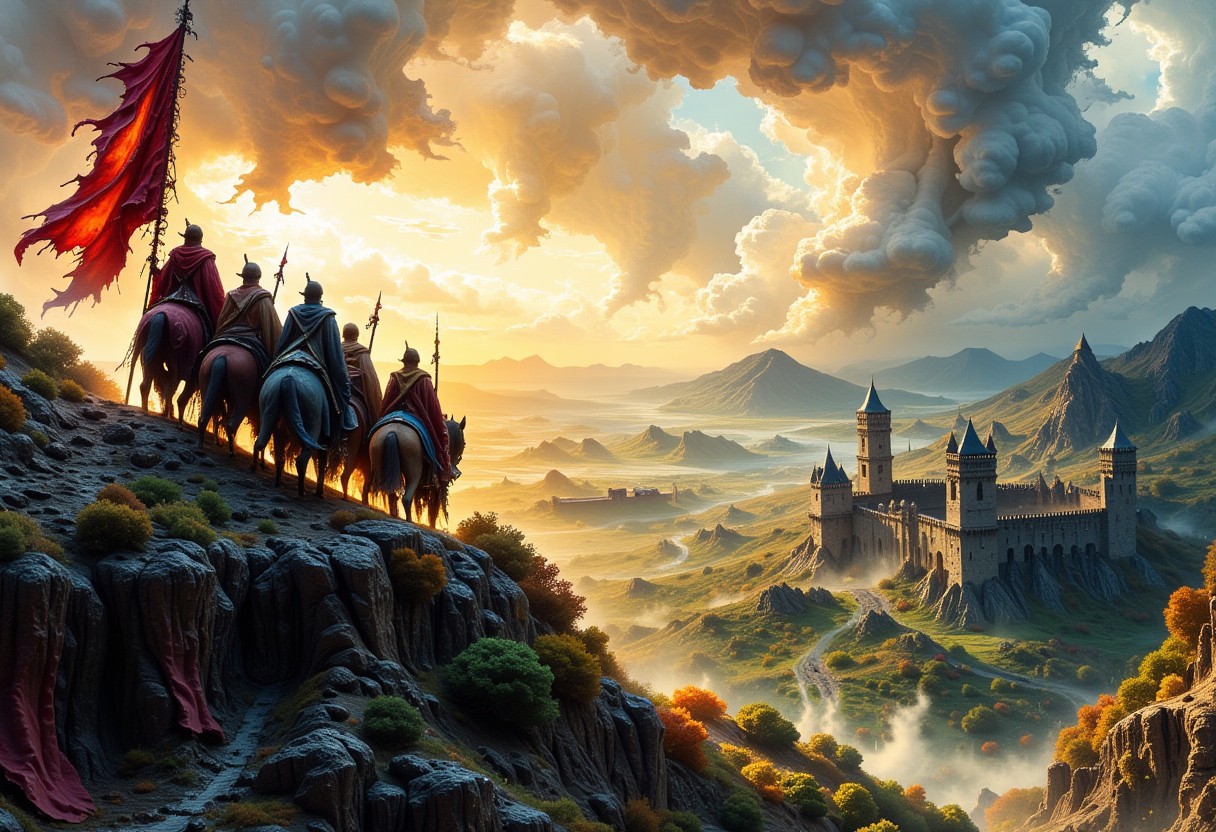 an epic painting in the style of Anato Finnstark, in the style of Jed-clrfl, a cavalry squad stands on a hill, banners flying, down the hill there is a vast valley with a fortress, the sky is cloudy but the sun still casts visible rays of light on the ground
