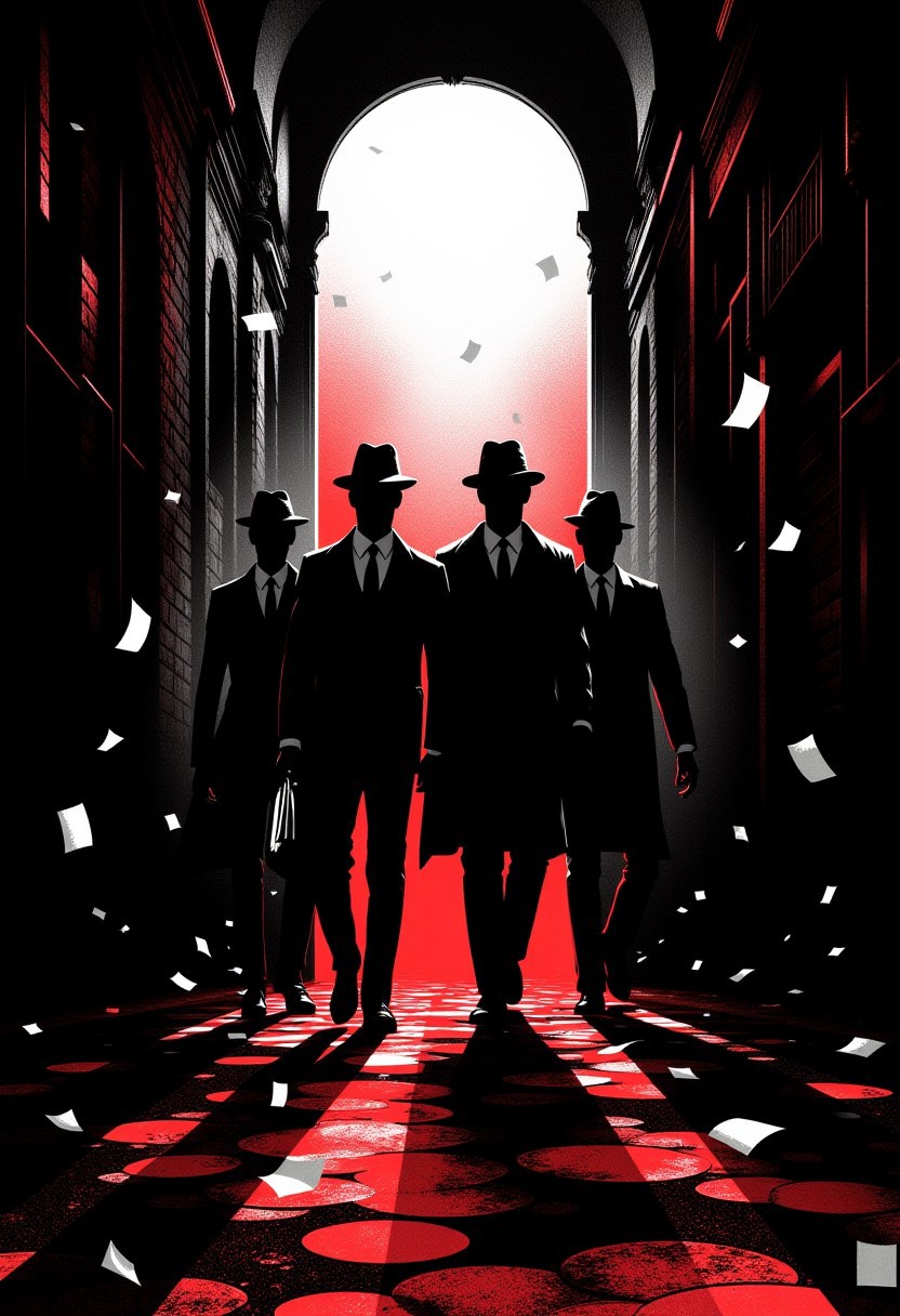 noir comic style with grey with red accents hues, a group of man silhouettes each wearing a bowler hat inside a circle of light reflected on the wall at the end of a dark alley, torn pieces of paper fly around driven by the wind