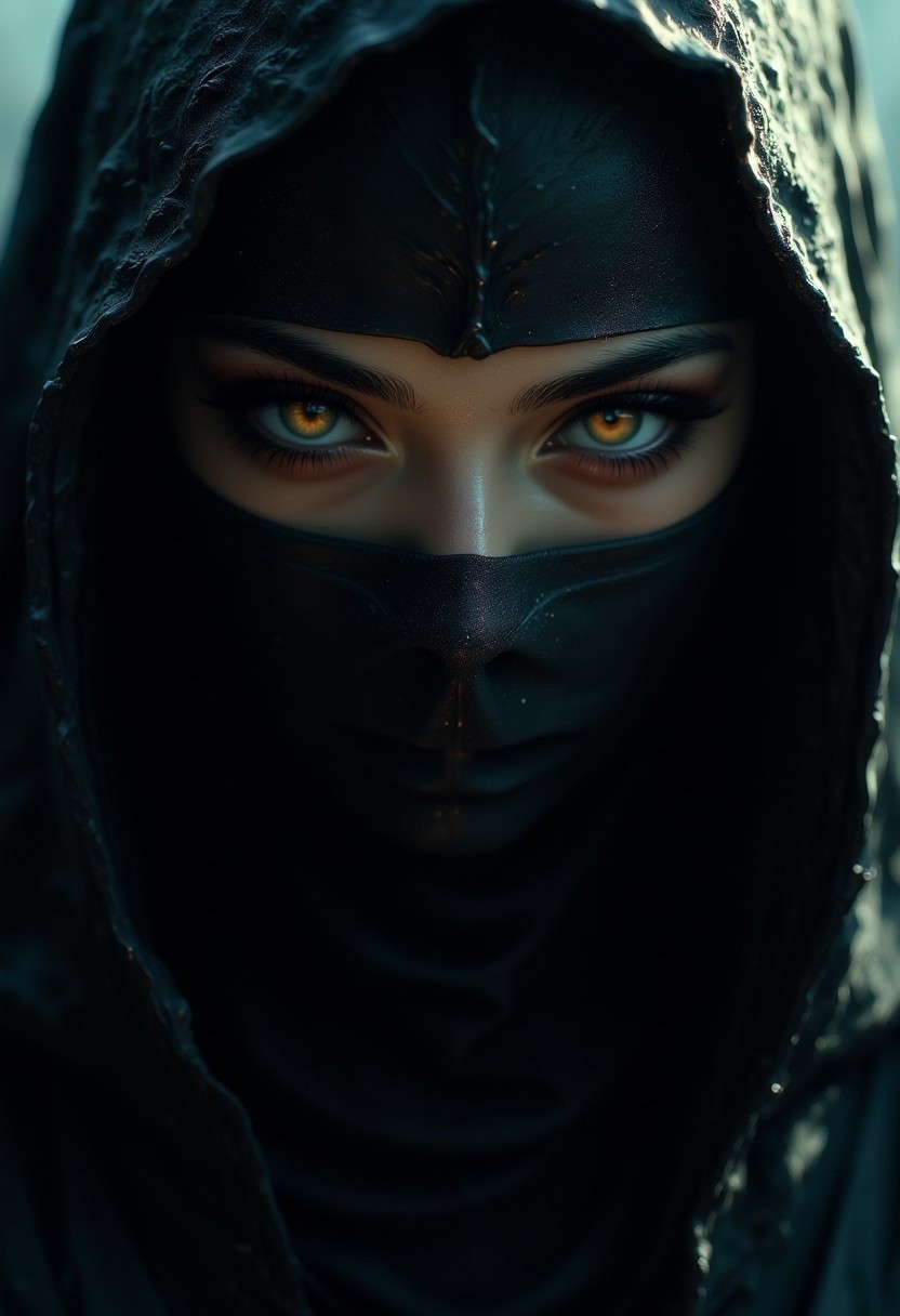 portrait of an oriental female assassin, clad in dark hood and mask covering the lower part of her face, directional lighting, chiascuro, atmospheric, direct intense gaze, moody, atmospheric, masterpiece
