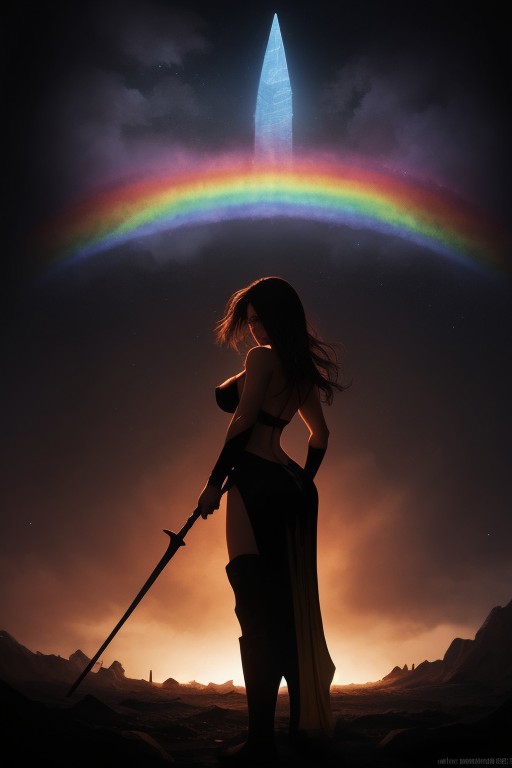 rainbow colored silhoutte outline against a dark background,a female reaper,anime,magical fantasy,universe,inspired by Maria Kreyn,Crystal,inverted,negative space, epic apocalyptic, large boobs, big ass