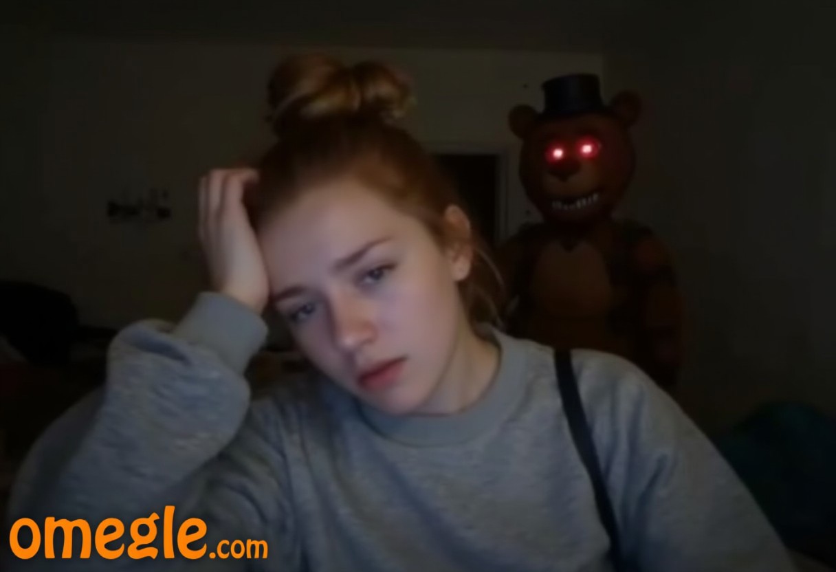 An omegle.com webcam of a young woman with messy ginger hair in a bun. wearing oversized sweatshirt, and is looking at the camera. her left hand is smacking head, she looks frustrated. she is in a room, dimly lit bedroom, in the background is Freddy Fazbear directly into the camera with glowing red eyes.