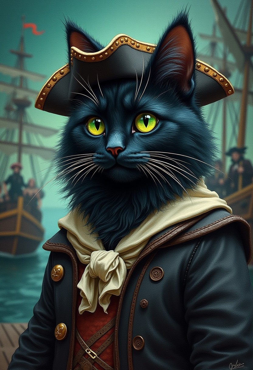 a black cat, green eyes, fluffy long fur, wearing an old fashioned sailors outfit with tricorn hat, old fashinoned sailing ship with human pirates in the background, triadic colors, vibrant colors, complex background, (watercolor painting:3), High detail, rich, intricate details, dark green background, night, natural realistic face proportions