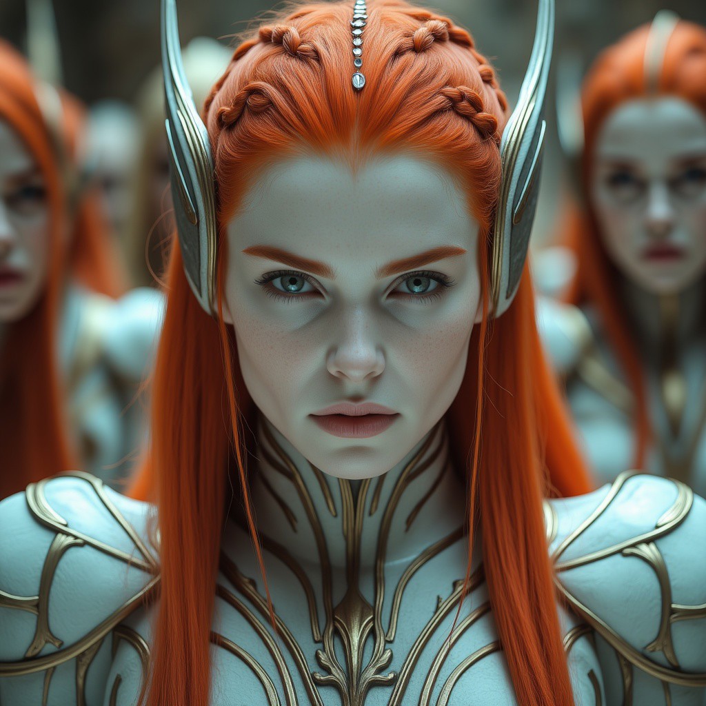This is a highly detailed, high-resolution CGI image featuring a striking, ethereal fantasy character. The central figure is a young woman with striking, vibrant red hair styled in intricate braids adorned with metallic, leaf-like ornaments. Her skin is pale with a subtle, freckled texture, and she has piercing green eyes that seem to gaze directly at the viewer. She wears an ornate, futuristic armor with intricate, silver and white designs that resemble a mix of armor and organic patterns. The armor's texture appears metallic and smooth, with a high sheen. In the background, there are other characters with similar, ethereal appearances, their faces partially obscured by the focus on the central figure. One has long, curly red hair, and another has straight, blonde hair.