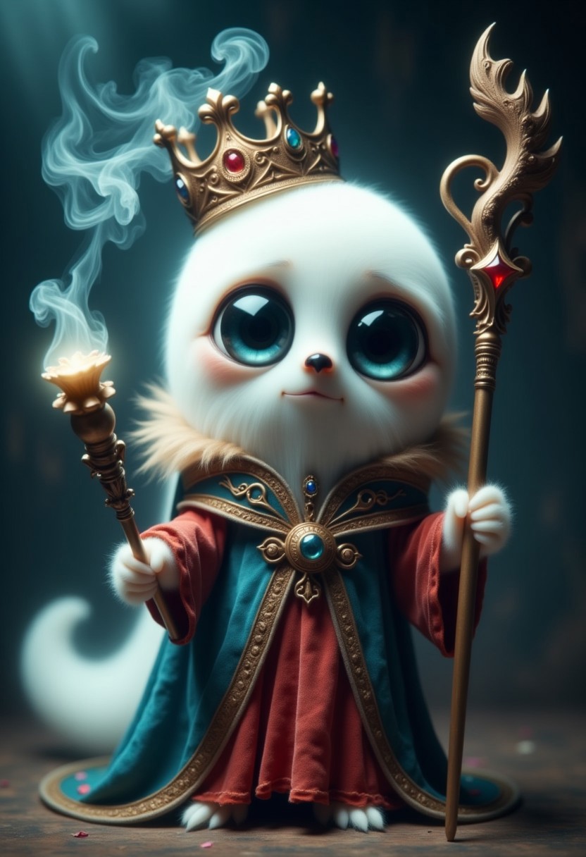 A cute ghost with his friend the sloth king with crown wearing a magic robe and holding a magic staff, Ghostlystyle