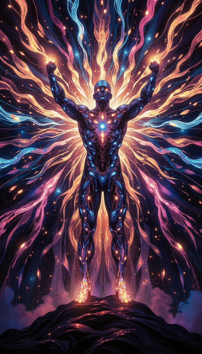 Bioluminescent, A single male figure, triumphant jubilation, silhouetted against an effulgent kaleidoscope of light streaks radiating outwards. Low-angle perspective, emphasizing ascendancy, full-body shot. Deep, opulent color palette, contrasting illumination emanating from the figure, meticulous attention to the interplay of light and shadow. The background should be a chaotic yet harmonious maelstrom of abstract shapes and colors, reflecting the dynamism of the figure's emotion.