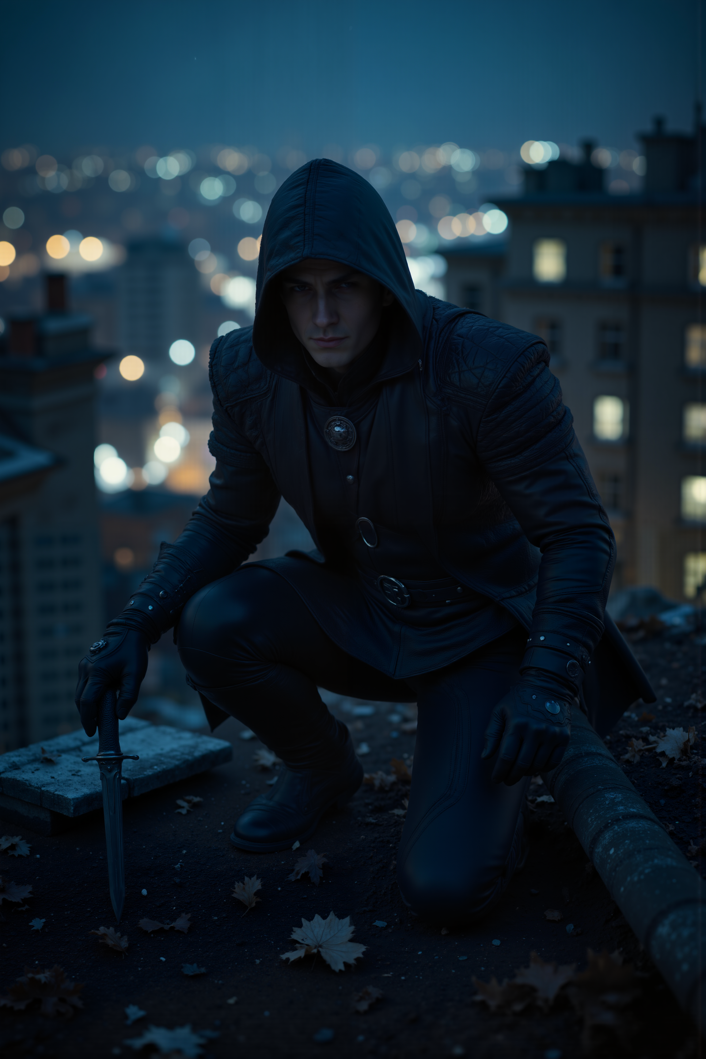 A hyper-realistic portrait, photorealistic photo close-up image of Perched on the rooftop of a dilapidated building, Dodger crouches low, his silhouette barely visible against the backdrop of the starlit sky. His dark cloak blends seamlessly into the night, and his sharp eyes glint as he surveys the city below, a sea of flickering lights and winding streets. The cold night air bites at his skin, but he barely notices, his focus entirely on the guard making his rounds far below. The rooftops are his domain, a world above the city where few dare to tread, and Dodger knows every tile, every chimney, every hidden path that will take him from one end of the city to the other without ever touching the ground. His gloved hand rests on the hilt of his dagger, its worn leather grip familiar and comforting. The distant sound of clanging bells echoes through the air, signaling the change of the guard, and Dodger smiles to himself. This is the moment heâs been waiting for. He takes a deep breath, the smell of chimney smoke and damp stone filling his lungs, and with a swift, practiced motion, he leaps silently across the gap to the next rooftop, disappearing into the shadows as if he were never there. (photography, high-resolution, dynamic, energetic,hyper-realistic, dramatic lighting, shallow depth of field.)<lora:aidmaMJ6.1-FLUX-V0.1:0.6><lora:Movie_Portrait><lora:Flux DetailerV2>