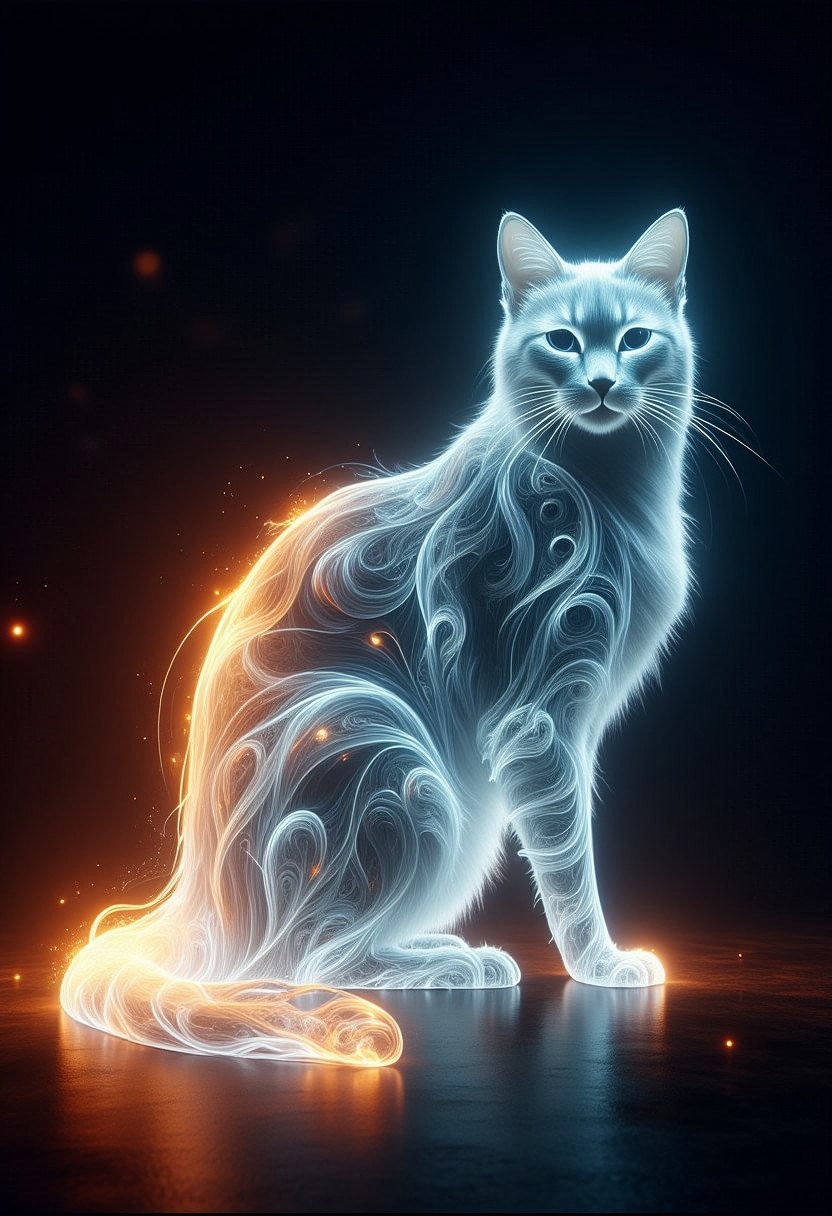 EtherealGlow, This is a digital artwork featuring a mystical, ethereal cat. The image is rendered in a fantasy, digital art style with a focus on light and glowing effects. The cat is depicted in a sitting position with a majestic, almost regal posture. Its fur appears to be made of swirling, glowing mist or light, giving it an ethereal, almost ghostly appearance.