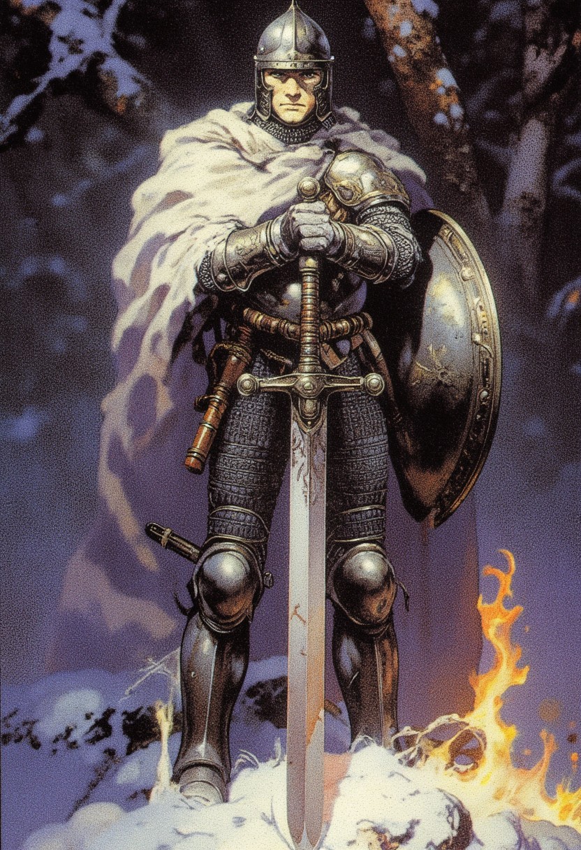 The image is a Frank Frazetta fantasy oil painting with with 90s retro medieval fantasy anime elements without noise or comic halftone effect. . The subject is a male knight with medieval black armor . The stark white gossamer dress. His body is slender and athletic. His body is covered with armor and chainmail. He wears a medieval knights breastplate over his chainmail, a detailed helmet with designs engraved on it covering head and mouth, has beautiful patterns on the armor design, he stands defiantly with shield on his left hand. and a long magic sword on lit with fire on right hand. The background is a detailed dark and snowy forest. The composition and the poses are dynamic. The composition is dominated by cool tones, with a muted, slightly gritty texture that enhances the gritty, medieval fantasy atmosphere.