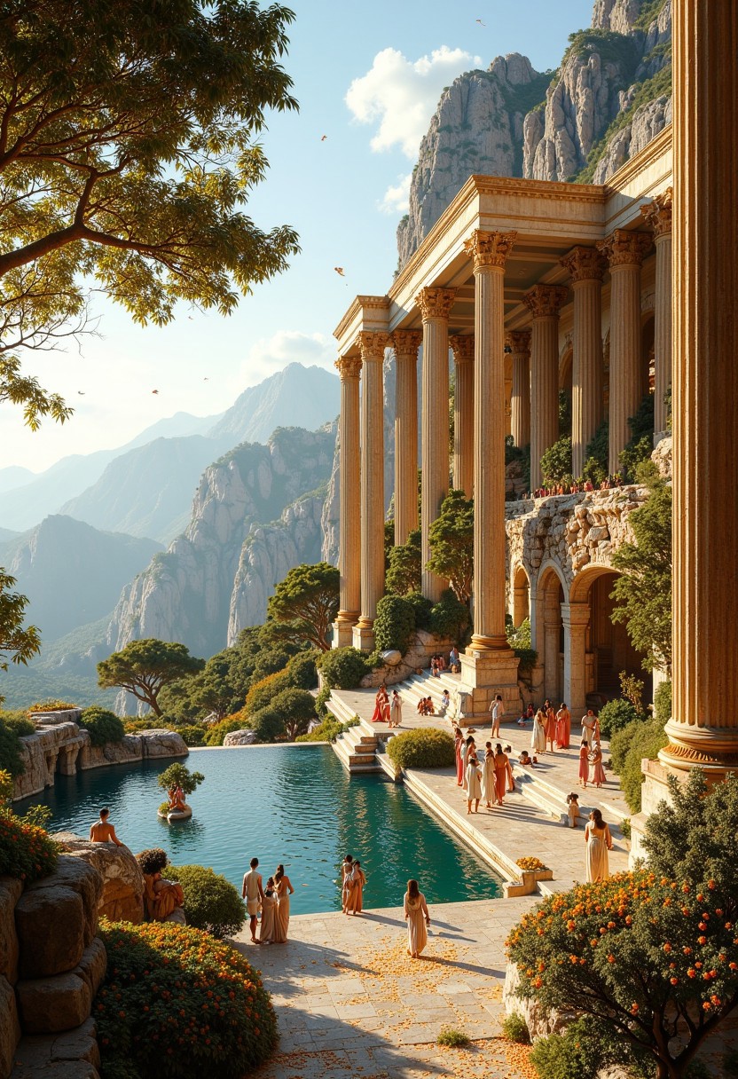 ancientstyle, at the top of Mount Olympus, gods and goddess bathe in the springs near the bar where ambrosia and alcoholic nectar fills the glasses of all in attendance, gold seeds and leaves scatter the wind, immaculate structures, pillars, Roman style
