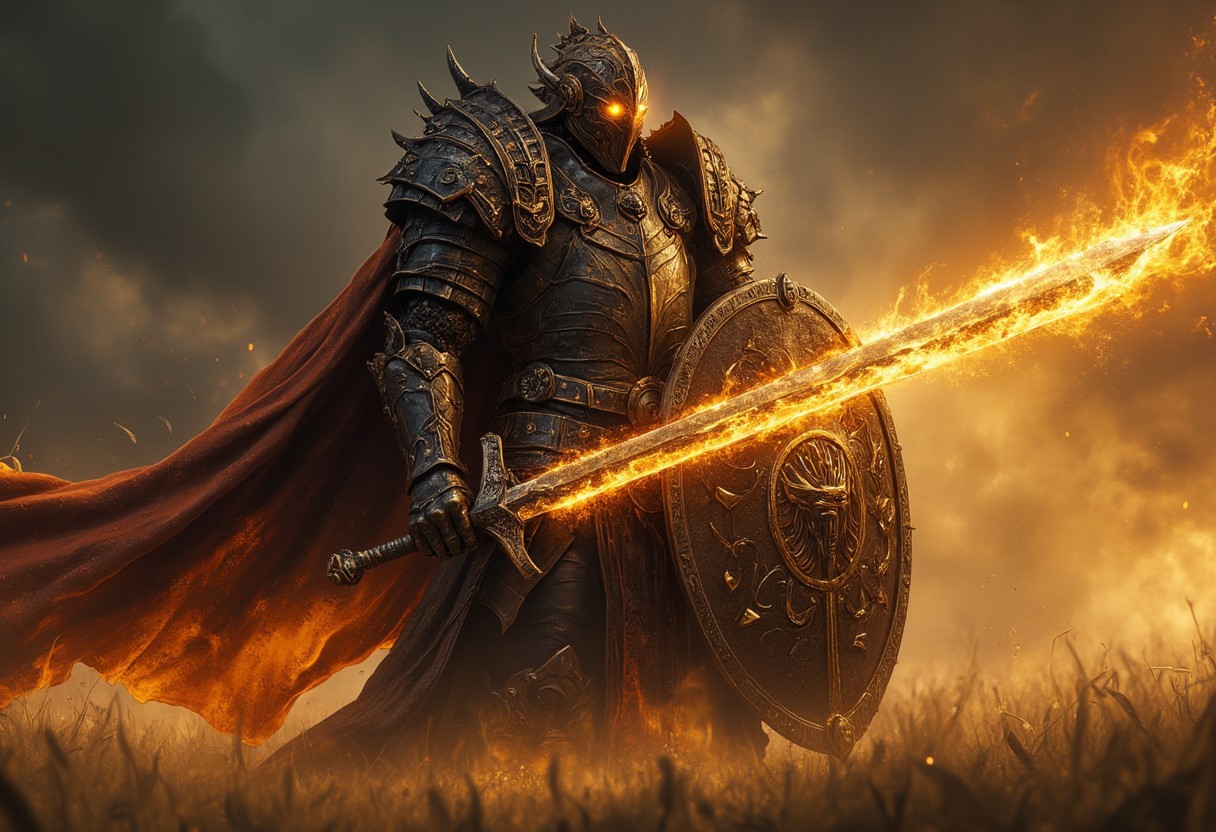 Closeup of a Action Scene shot of a towering warforged hkstyle knight with Long billowing cape in the heat of an intense, action-packed battle, cinematic movie-still-shot in 4k. The hkstyle knight's intricately designed, battle-worn helmet emits glowing amber eyes and reflects the glow of his weapon—an arcane sword. The blade crackles with golden energy, gathering at its tip, The energy radiates along the length of the blade, casting a glow that illuminates the knight’s helmet and armor, creating stark contrasts between light and deep shadows. In his other hand, the knight wields an impressive shield, adorned with the iconic symbol of an elder god. The shield emanates a sense of awe as if imbued with divine magic adding to the overall awe of his presence. The glow from the sword throws the intricate details of the shield into sharp relief, casting long shadows that flicker across the Long Plains scenery battlefield amidst grasslands
