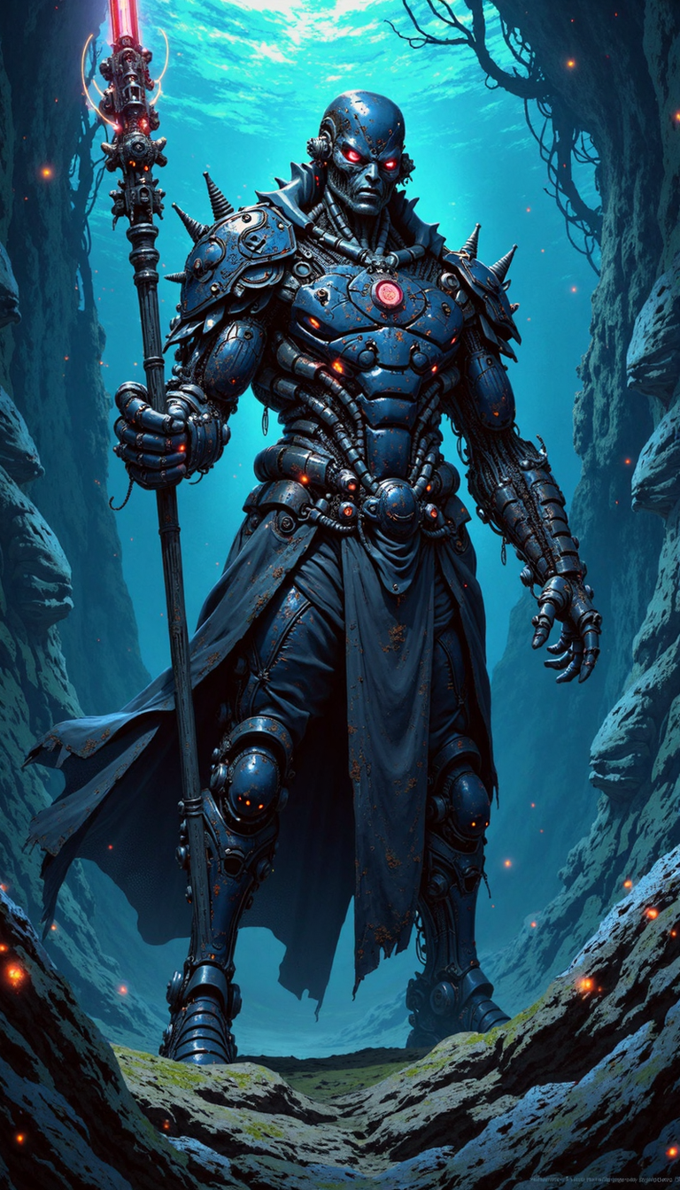 arob,robot,cyborg,metal,steel,cyberpunk,anime,mythp0rt, An eldritch horror, wreathed in Stygian tenebrosity, stands sentinel amidst an abyssopelagic realm. Bioluminescent ichthyofauna, their scales glimmering with an otherworldly iridescence, weave through an entanglement of abyssal flora. The entity, its form a grotesque mockery of sapient anatomy, clutches a staff that pulsates with an arcane luminescence. The water, a canvas of cerulean and sapphire hues, distorts the light, casting eerie crepuscular rays that illuminate the scene with an uncanny pallor. Emphasize the horror's amorphous nature, its form shifting and undulating like a miasma given unholy life. The camera, positioned at a low angle, should imbue the horror with an imposing, almost divine, presence. The background teems with indistinct shapes, hinting at the unspeakable denizens of this benighted abyss.