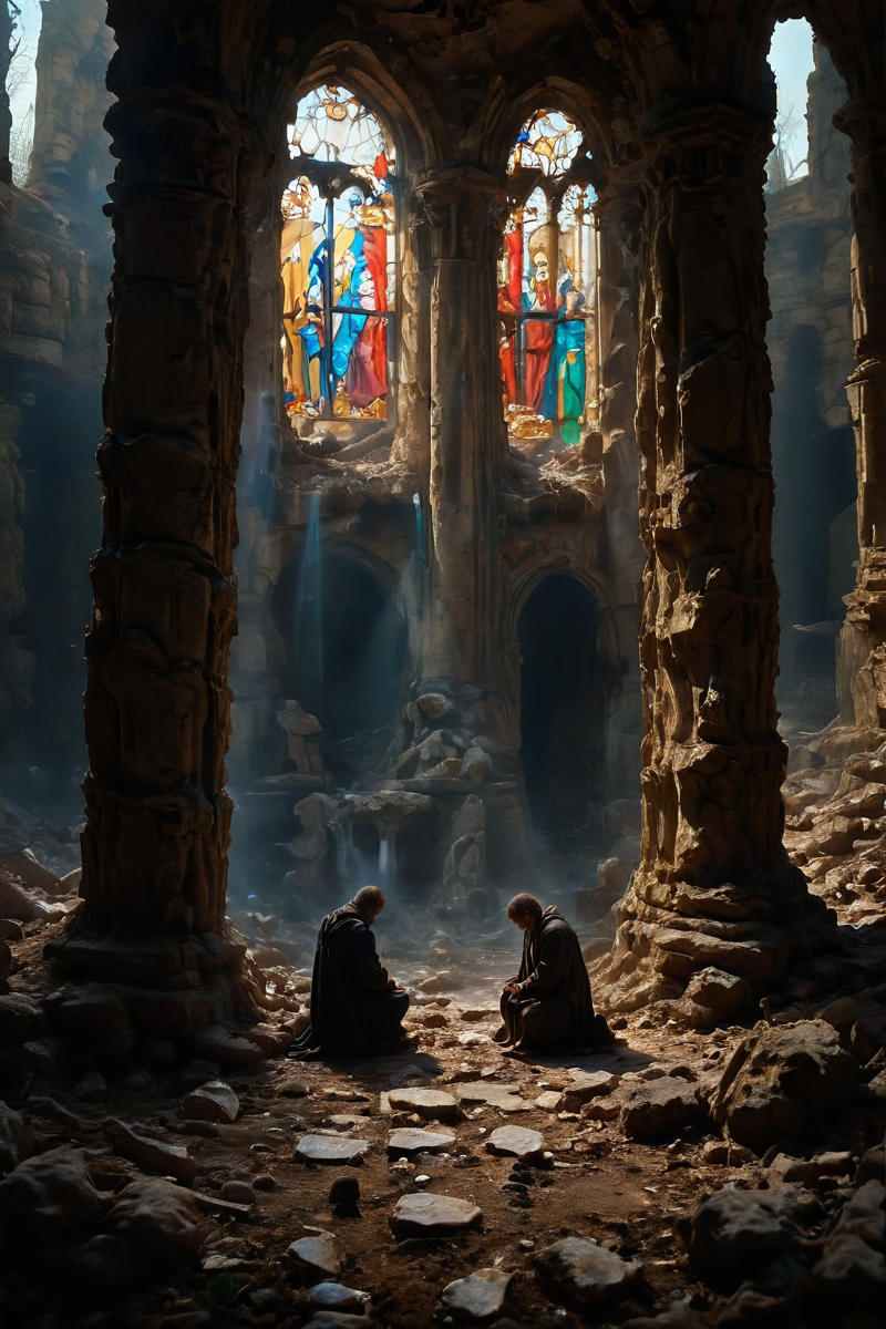 A crumbling cathedral with stained glass windows and broken pillars, with a single figure kneeling in prayer in the middle of the ruins. <lora:add-detail-xl:1> <lora:Flux-style-xl-lora:1> <lora:zavy-cntrst-sdxl:1> <lora:SDXLFaeTastic2400:1> <lora:extremely_detailed:1>
