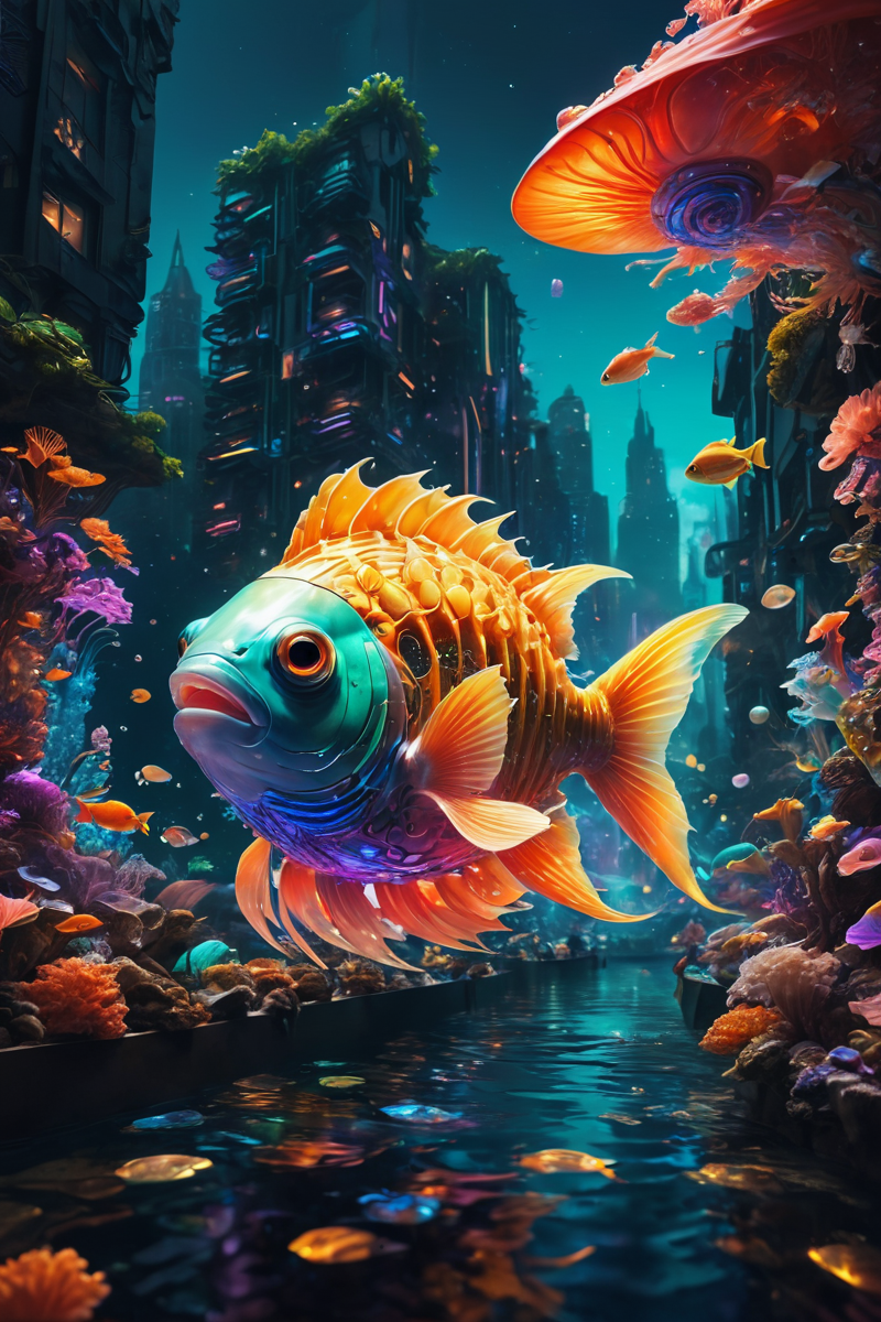 A futuristic, underwater metropolis where towering, bioluminescent skyscrapers made of coral and shells pierce the darkness, as schools of rainbow-colored fish dart through the streets, and a procession of merfolk in shimmering, scale-like armor ride giant, genetically engineered sea creatures through the city's central square. 8K <lora:SDXLFaeTastic2400:1>