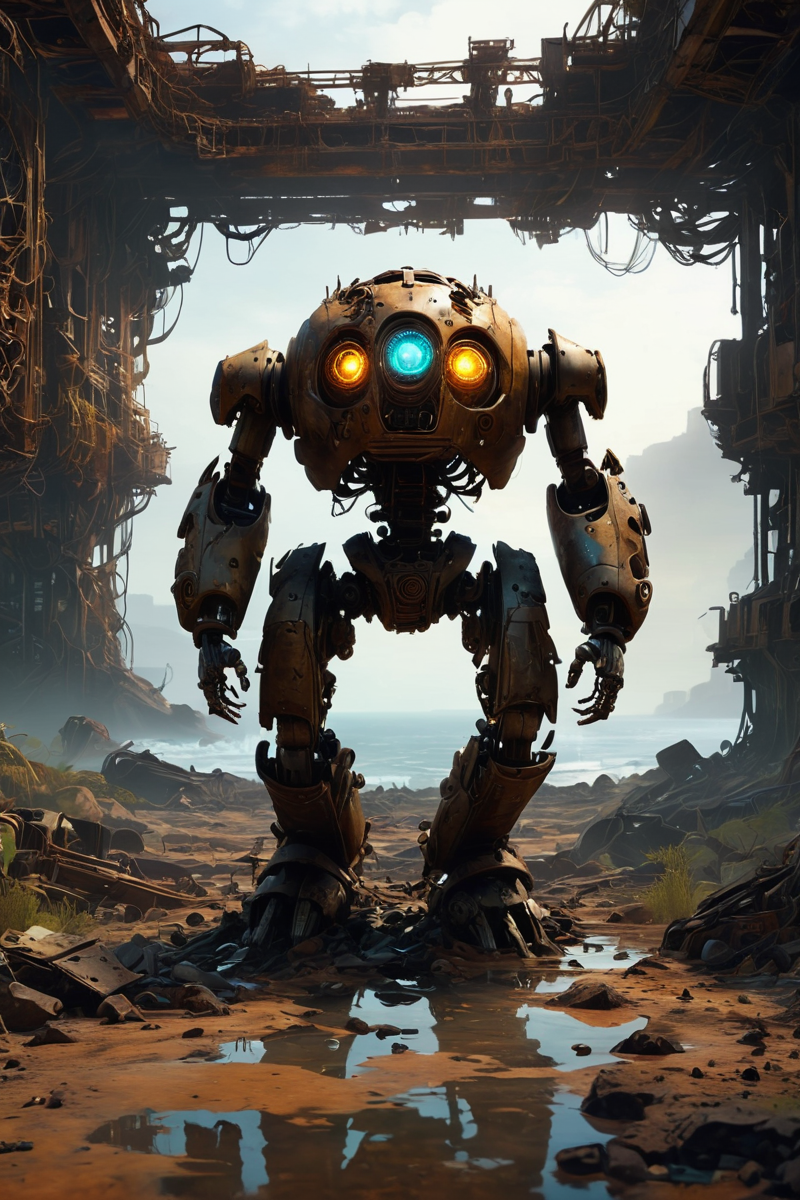 A post-apocalyptic wasteland where a lone, damaged robot wanders through a sea of rusting, abandoned machinery, its eyes glowing with a faint, desperate light, as a massive, skeletal structure looms in the background, a grim reminder of a long-lost civilization. 8K <lora:SDXLFaeTastic2400:1>