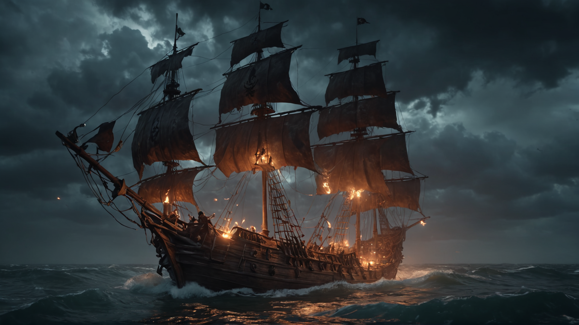 1 cursed pirate ship adrift on a stormy sea, with tattered sails, skeletal crew members, 2 masts, and ghostly flames flickering in the lanterns, under a sky torn by lightning. 8K