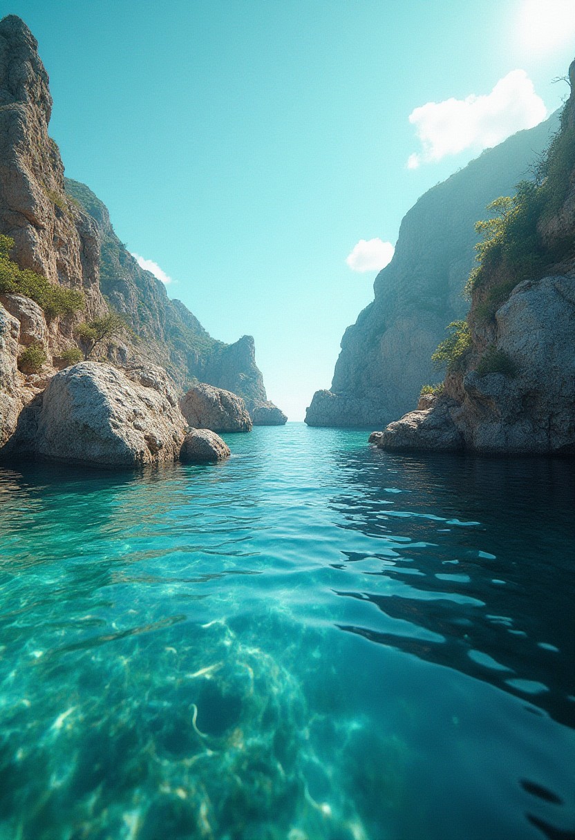 Jagged rocks emerge from pristine, clear turquoise waters on a bright, sunny day, their rough edges contrasting against the smooth surface of the ocean. Roberto Bernardi’s impeccable attention to water reflections and clarity creates a sense of depth, as the sunlight dances across the waves. Keng Lye adds a hyperreal touch to the aquatic textures, capturing every ripple and underwater detail with lifelike precision. Raphaella Spence’s wide, panoramic view enhances the scene, stretching the horizon and immersing the viewer in the serene, sunlit expanse of sea and sky. vivid colors. detailmaximizer, aidmaMJ6.1, Movie Still, Film Still, Cinematic, Cinematic Shot, Cinematic Lighting, detailxl, flux-style, midjourneyv6.1