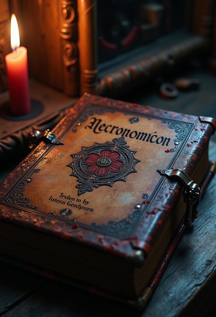 cinematic shot of ancient grimoire in creepy occult shop, large title "Necronomicon" in gothic font, leather-bound cover with intricate engravings, metal clasps and crimson stains, eerie atmosphere, dim lighting with sharp shadows, deep colors