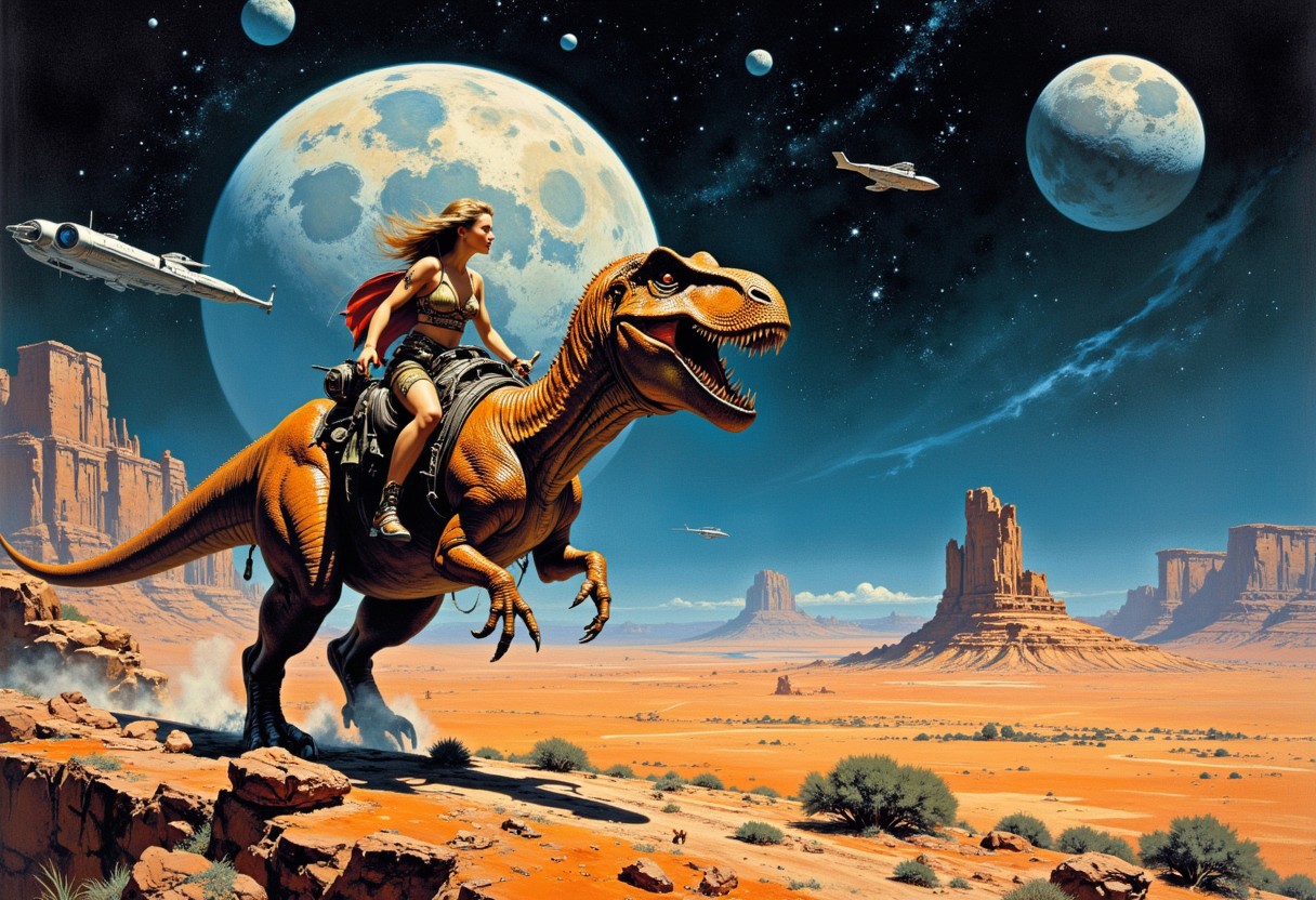 Frank Frazetta fantasy oil painting, retro sci-fi, a woman riding a dinosaur across the plains of an alien world, directly behind her is the moon rising up over the horizion, A fantastical planet and multiple stars and moons fill the sky, enhancing the sci-fi atmosphere. <lora:FluxMythP0rtr4itStyle:0.8> MythP0rt, <lora:ARTifacts:0.66> <lora:artisketchyfs-v02:0.55>
