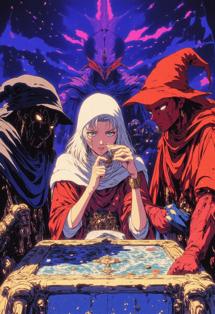drkfnts style, ne0nfant4sy, digital illustration, A vibrant, dynamic digital artwork with a pixelated texture and a vivid color palette, showing a lively scene of three distinct characters from Final Fantasy engaged in a tense, strategic Dungeons and Dragons board game. The characters are seated around the game board, leaning in with focused expressions. On the left, the Black Mage, with a tall, wiry steeple hat and two glowing comical dots for eyes, wears an oversized blue cloak that drapes heavily. In the middle, acting as the Dungeon Master, is the White Mage, a cute, cheerful figure with blond hair peeking out from under a white hooded cloak with red trim. She gestures excitedly, holding up game pieces or a book. To the right, the Red Mage wears a similar outfit to the Black Mage, only in a striking red color, with a wide-brimmed red hat casting a shadow over his serious face. The overall style is retro anime, with sharp, defined lines and vibrant colors, capturing a playful yet intense gaming atmosphere. crisp anime lines, retro anime artstyle, detailed facial expressions, glowing effects around the board, cinematic lighting.