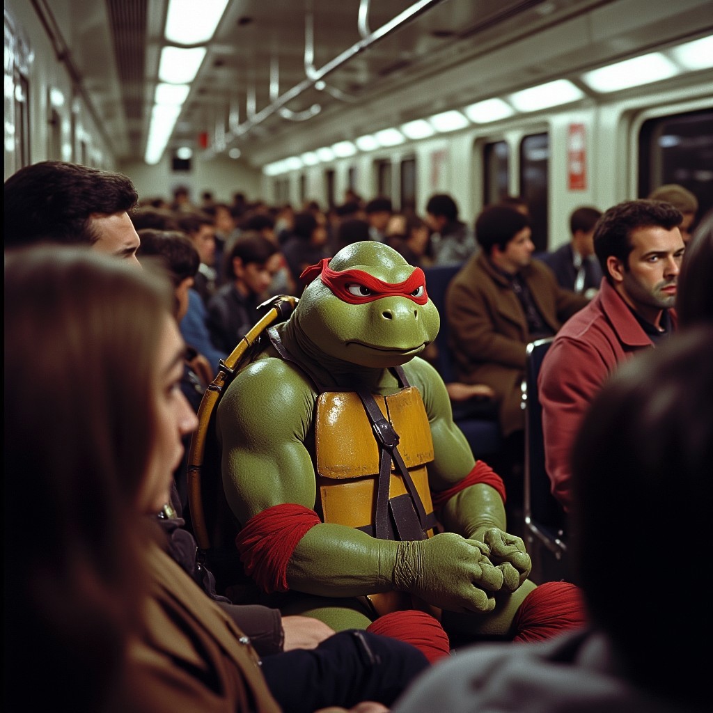 Teenage Mutant Ninja Turtle sitting on a crowded subway car, Anthropomorphic turtle, retro 80s nostalgia