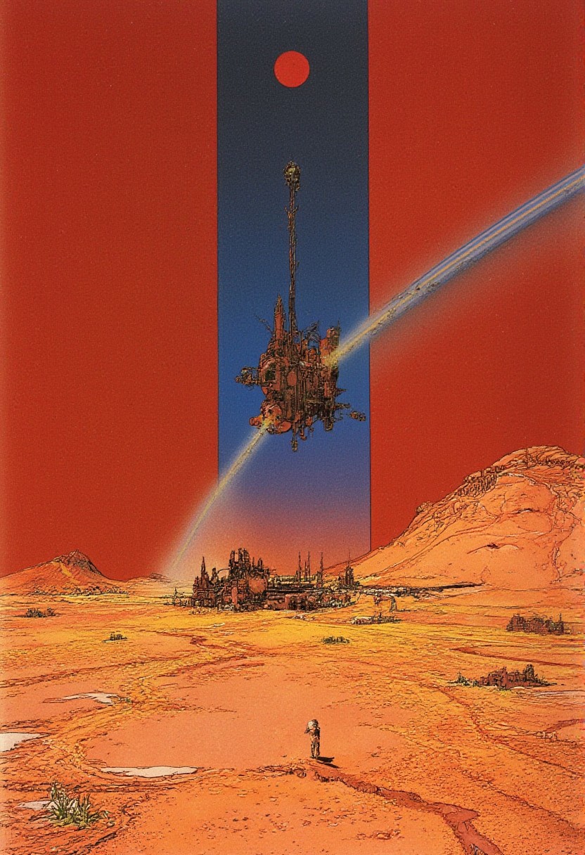 (wide view illustration of remote futuristic city in the middle of a desert on barren planet surface (the sky is red-orange degradation)) (On the middle top (a blue planet with a ring)) (Masterpiece, best quality, award winning, highly intricate details, classic)