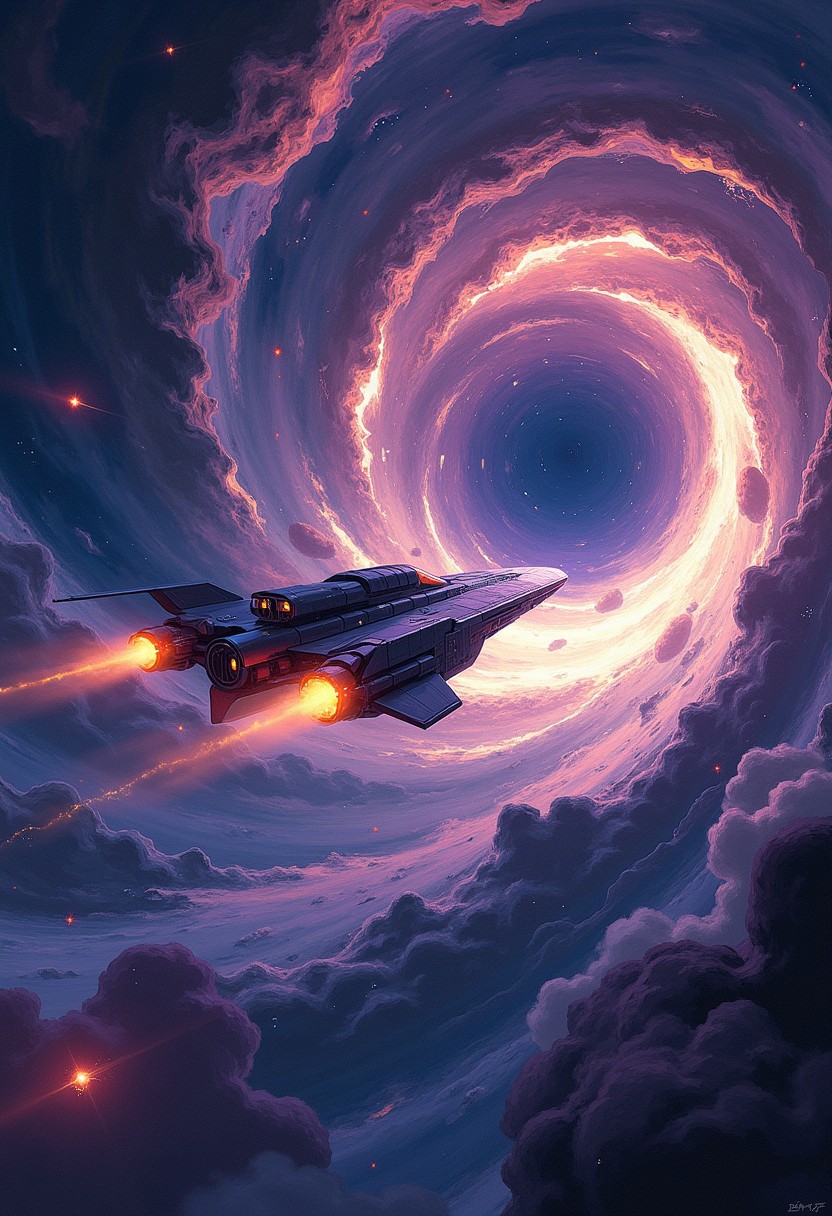 DB4RZ style painting, Abstract illustration, A sleek, futuristic spaceship is caught in the gravitational pull of a massive wormhole in deep space. The wormhole itself is a swirling vortex of bright, pulsating light, with bands of color ranging from deep purples to electric blues and radiant whites, twisting and spiraling toward a dark, unknown center. The ship’s engines burn bright orange as it struggles against the immense forces, its metallic surface reflecting the dazzling light from the wormhole. Stars in the background stretch and warp, distorting as they are drawn into the gravitational field of the cosmic anomaly. Energy arcs and lightning-like tendrils shoot out from the edges of the wormhole, crackling with power. The wormhole’s interior looks infinite and chaotic, with fragmented glimpses of distant galaxies and unknown dimensions flashing within. The scene is intense, with the ship teetering on the edge of the unknown as it is drawn deeper into the swirling maw of the wormhole.