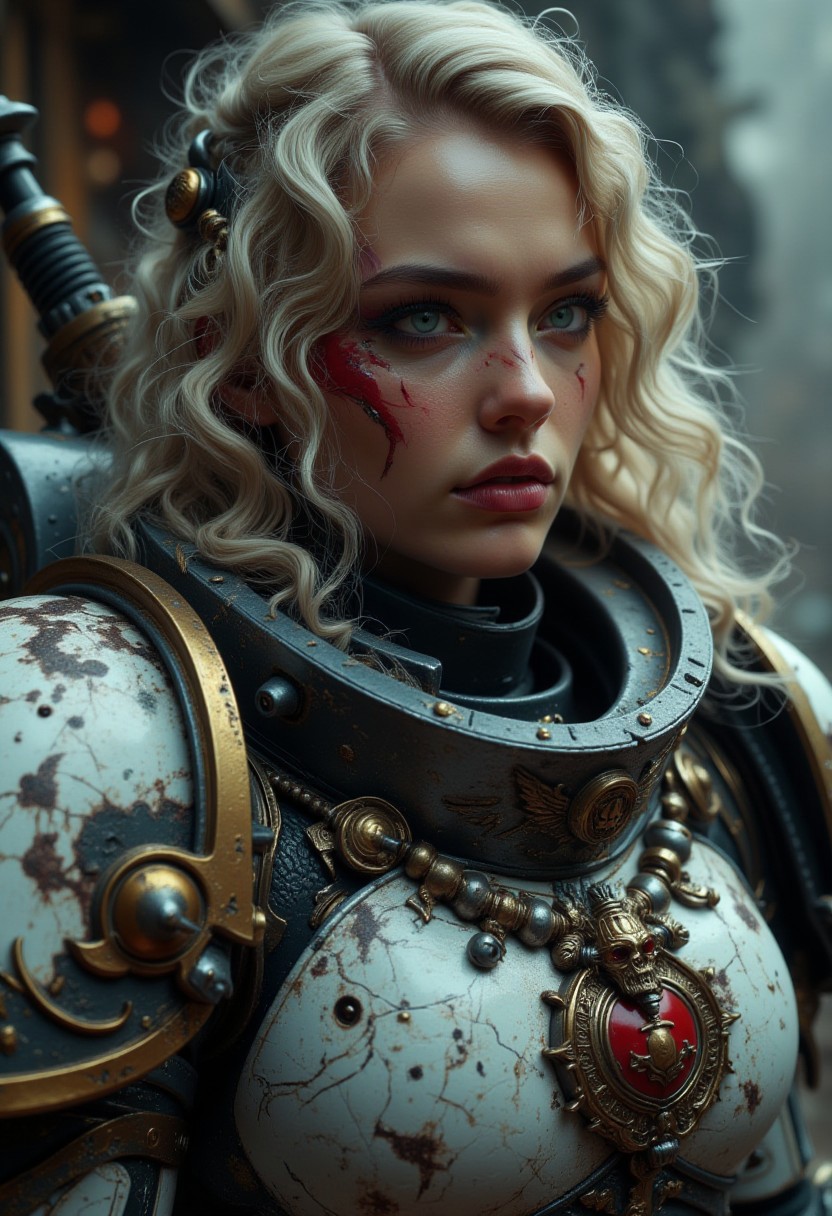 cinematic film still, close up, female WhiteS40K holding a sword, clad in power armor. long blonde hair, with rich, vibrant colors and meticulous textures for her power armor, vignette, highly detailed, bokeh, moody, epic, film grain, grainy